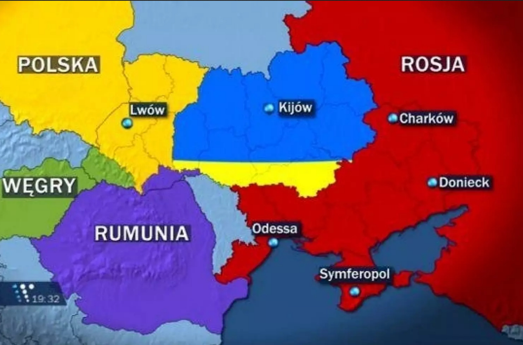 Случилось это в марте 2014 года. Карта, по-видимому, нарисованная редакцией польского телеканала, была иллюстрацией к сообщению об одном из экстравагантных заявлений Владимира Жириновского. Он тогда предложил разделить Украину между Россией, Польшей, Венгрией и Румынией и посоветовал Польше потребовать проведения референдума относительно присоединения пяти украинских областей: Волынской, Львовской, Ивано-Франковской, Тернопольской и Ровенской. Сообщения об этом телевизионном сюжете и изображение карты можно найти, например, на румынском и словацком (венгроязычном) сайтах, посвященным телевидению.
