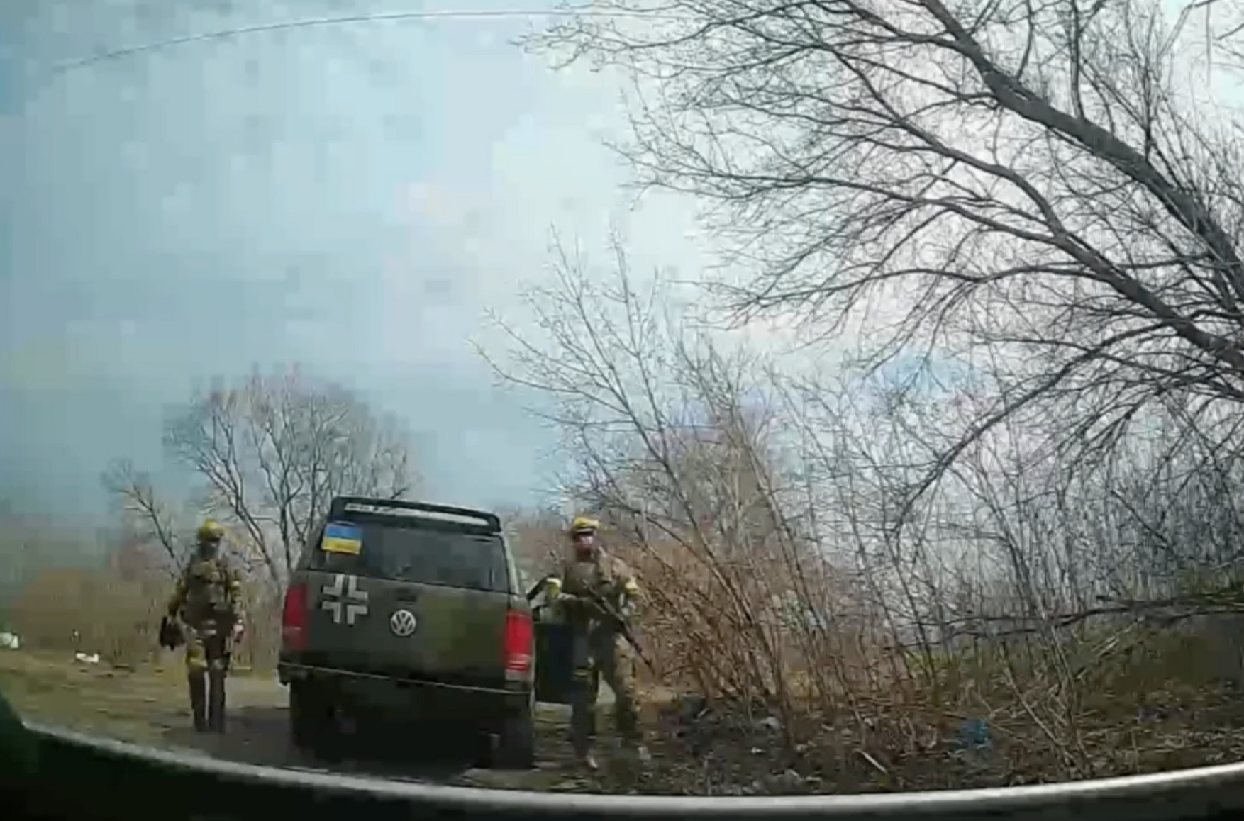«Посмотрите, как первый держит свое оружие. Как будто он знает, что он в безопасности. Он стреляет из своего оружия перед машиной, чтобы напугать женщину и ребенка — для чего? И они оба не видят камеру?» — пишут аналитики GeoConfirmed.