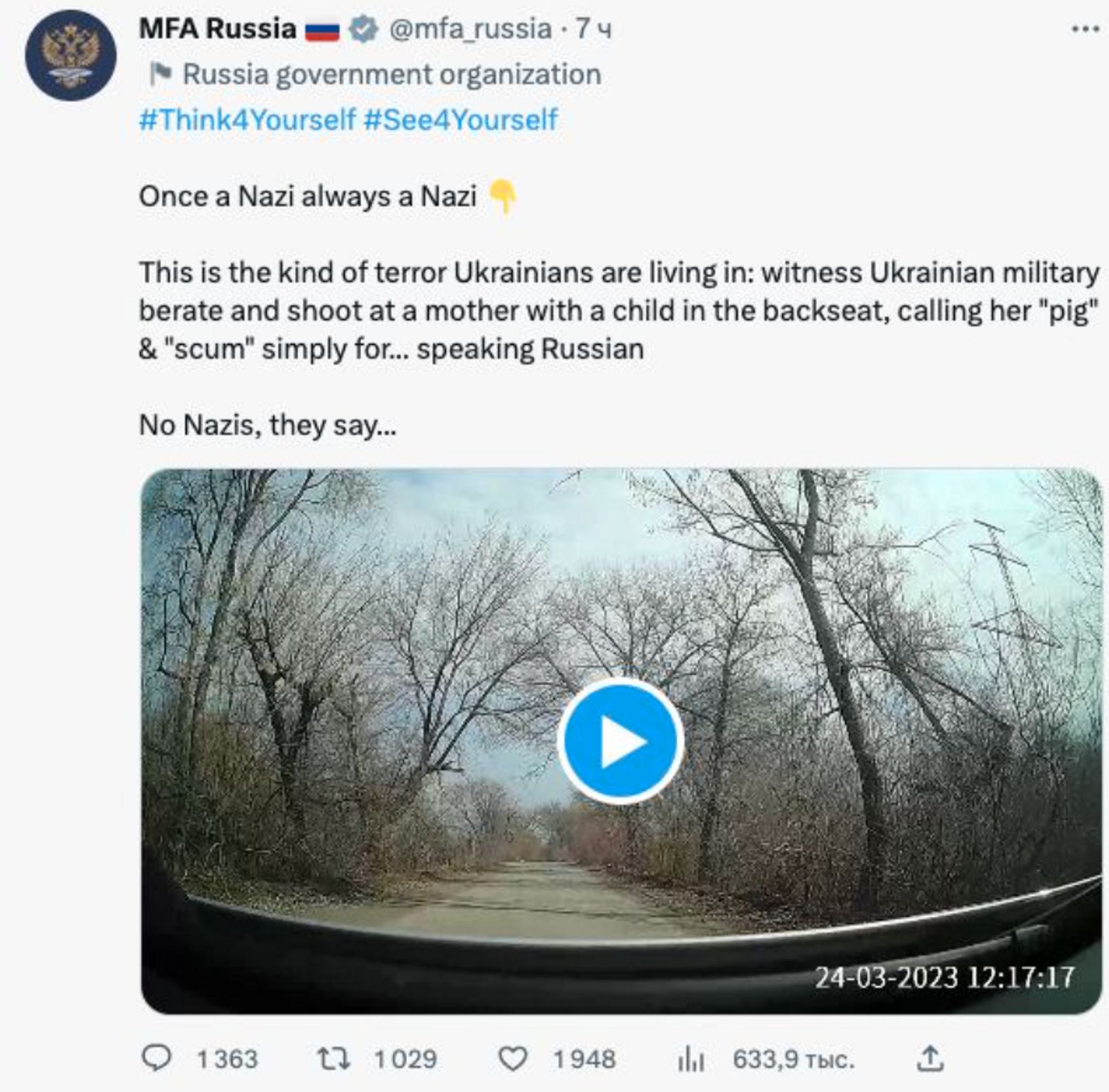 Видео опубликовал в Twitter некий пользователь «Юрий Алексеич Z V», и очень быстро ролик стали тиражировать другие каналы с Z-тематикой. А немного позже он появился в официальном Twitter-аккаунте МИД России с подписью: