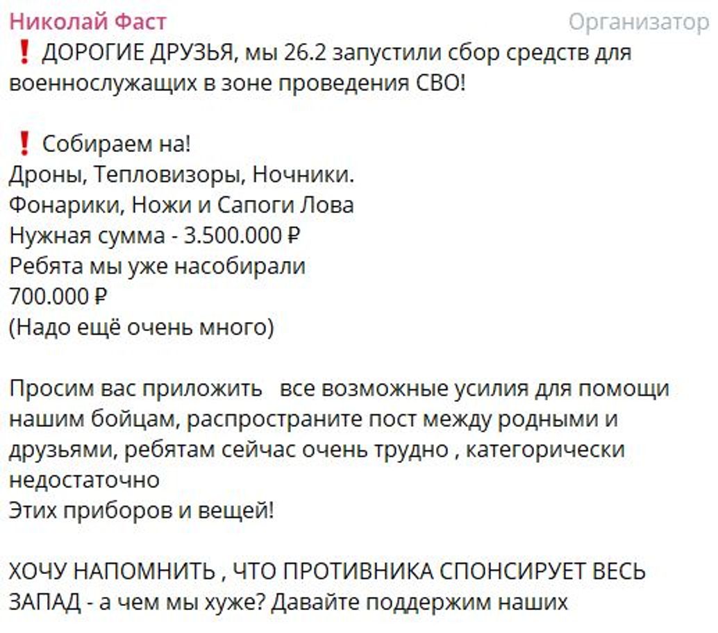 В реальности Фаст в своем Telegram-канале «Братская мотопомощь» собирает в основном на дроны, тепловизоры, ночники и другие товары для российских военных.
