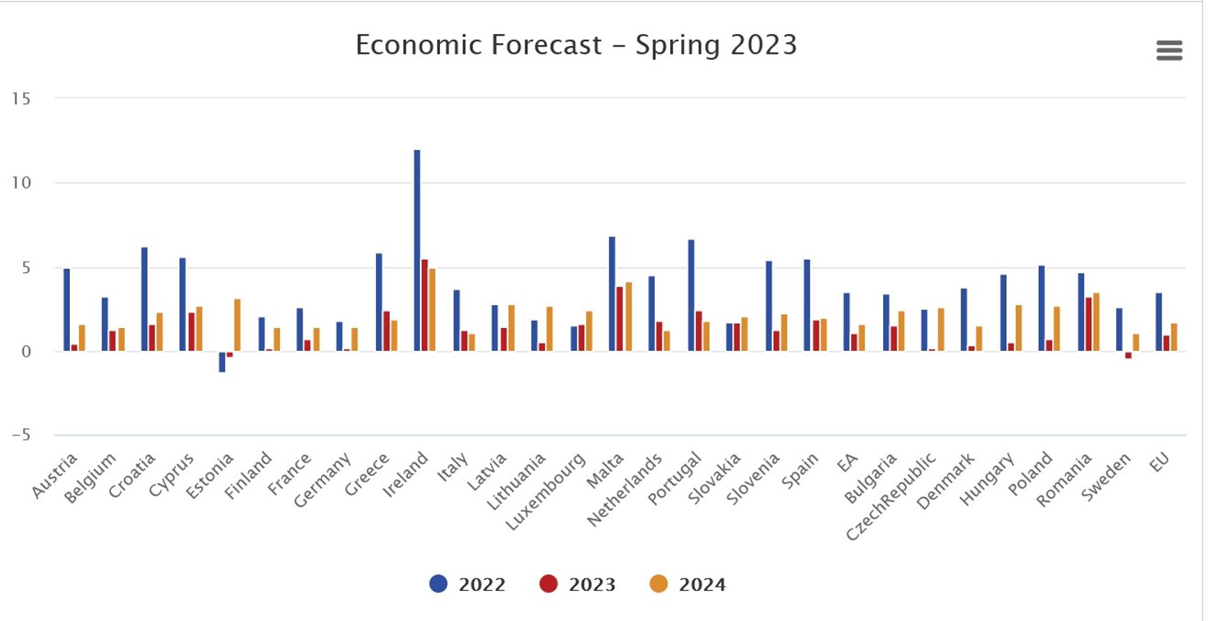 Опубликован также и прогноз по каждой из стран ЕС. Падение ВВП по итогам 2023 года ожидается только в двух из них — Швеции (на 0,5%) и Эстонии (0,4%). Во всех остальных ВВП вырастет; самый большой рост прогнозируется в Ирландии (5,5%). В крупнейших экономиках ЕС ожидается небольшой, но все же рост ВВП: в Германии на 0,2%, во Франции на 0,7%, в Италии на 1,2%. В 2024 году предвидится рост ВВП во всех странах ЕС.