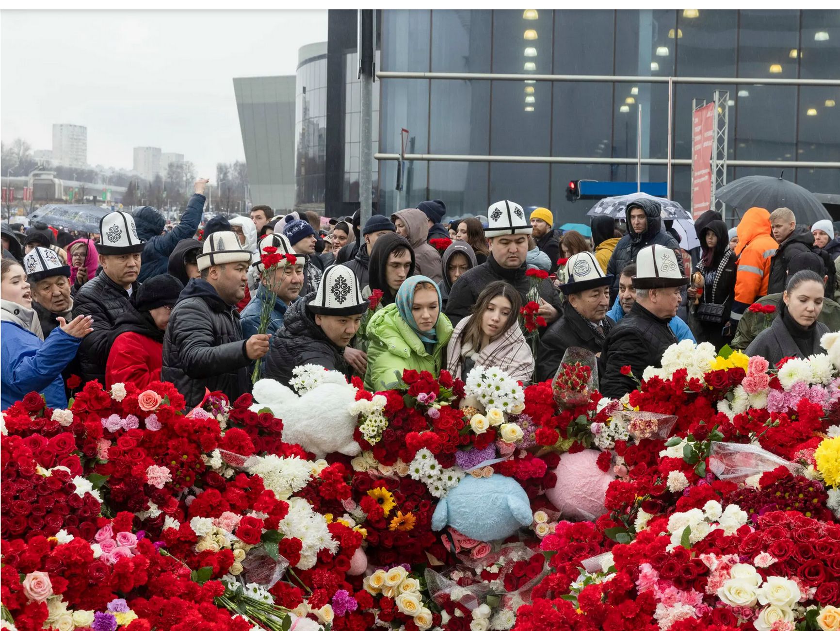 «Смертоносное нападение на обширный торгово-развлекательный комплекс в ближайшем пригороде Москвы шокировало россиян: в минувшие выходные большие толпы людей возложили тысячи цветов к месту нападения, а президент Владимир Путин пообещал добиться справедливости за то, что, по его словам, было „цинично спланированным варварским терактом”. <…>