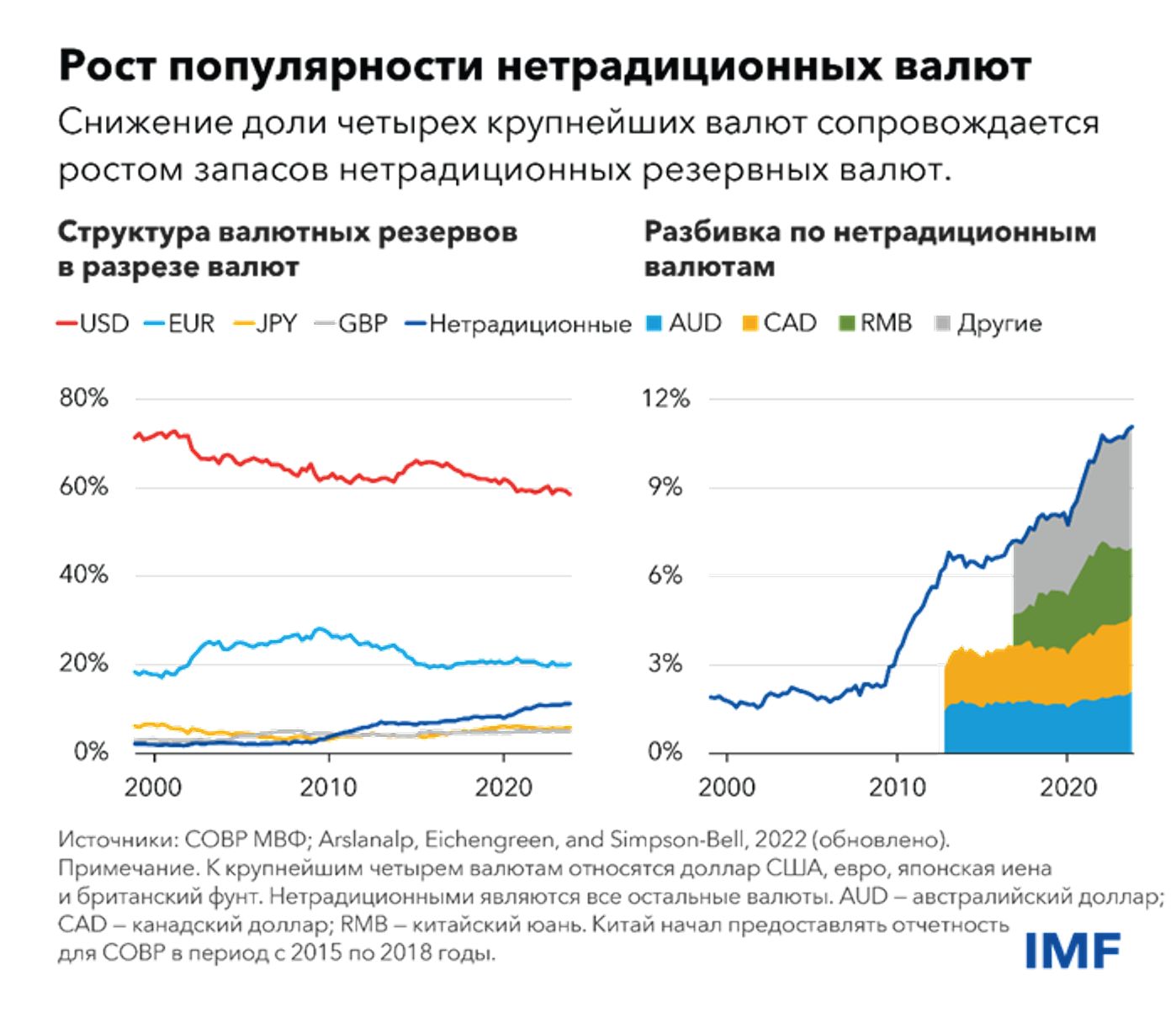 На инфографике показаны данные МВФ за 2022 год. С тех пор доля юаня в международных резервах стала сокращаться и к апрелю 2024 года упала до трехлетнего минимума.