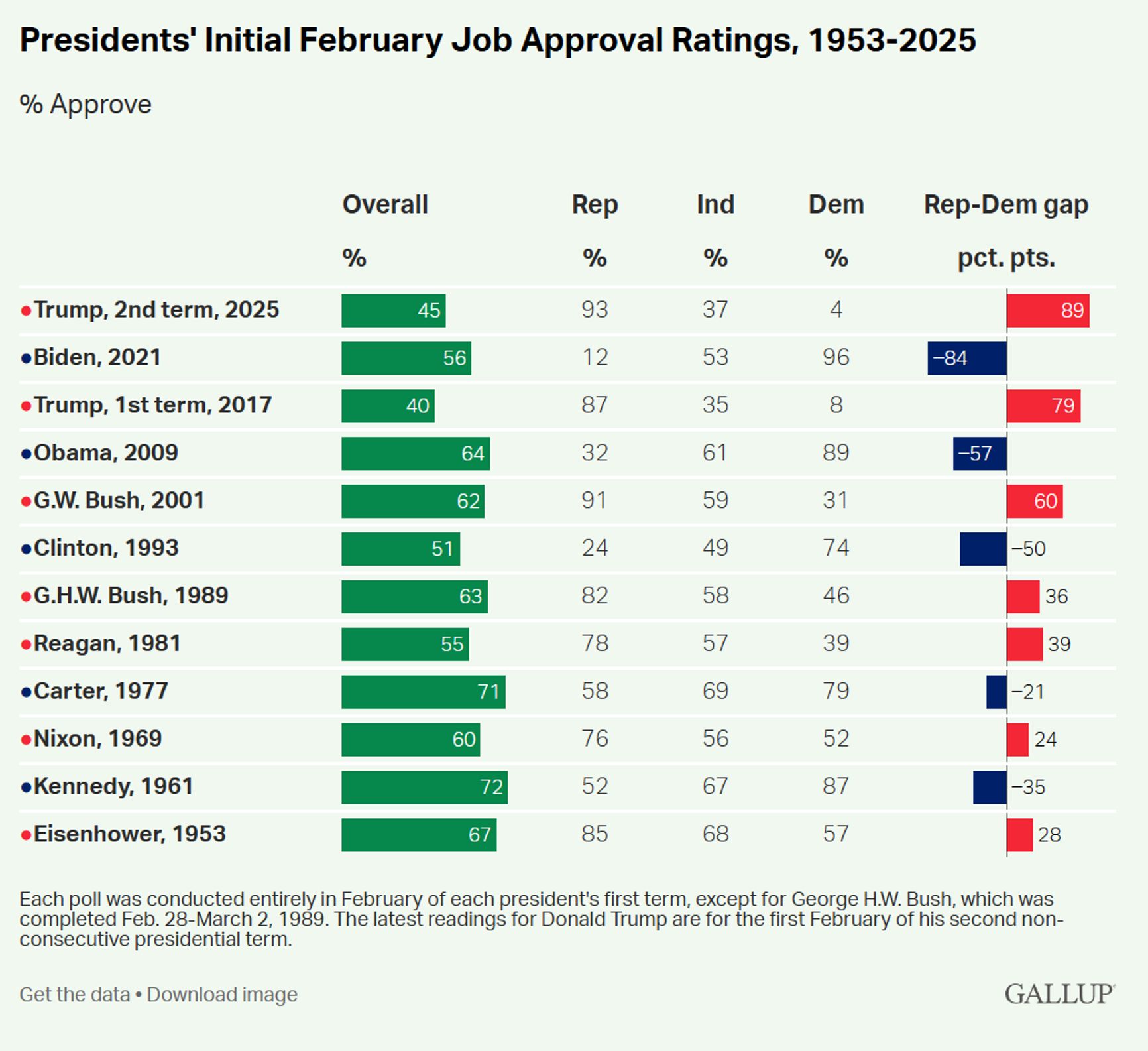 У самого же Трампа рейтинг в США ниже, причем имеет тенденцию к дальнейшему снижению. Так, например, по данным Gallup рейтинг одобрения Трампа упал до 45% и для только что вступившего в должность президента — это самые низкие цифры с середины XX века (хуже было только у самого же Трампа при первом сроке):