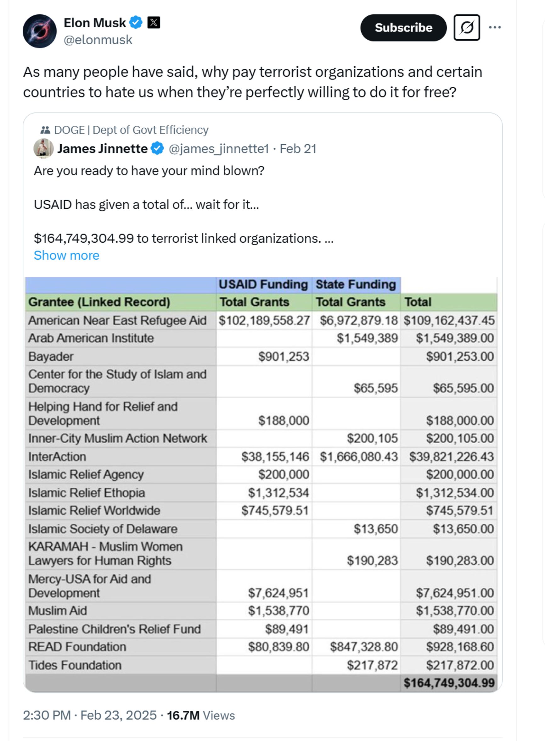 Кроме того, Маск распространяет скриншот некой таблицы, из которой якобы следует, что USAID передало «организациям, связанным с террористами», более $164 млн.