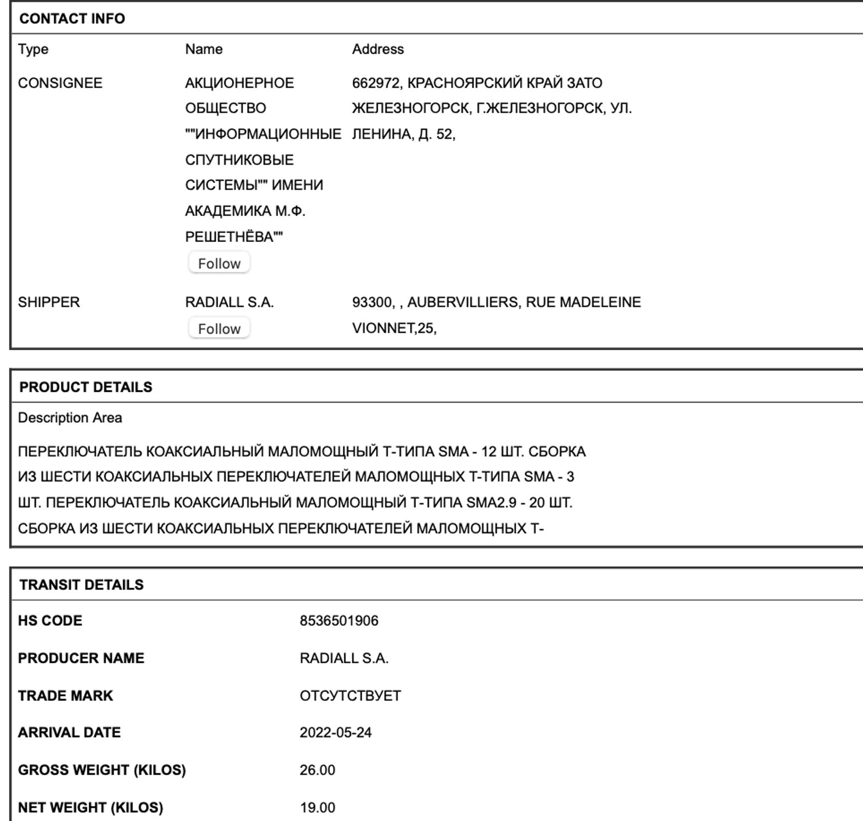 «ИСС» находится только под санкциями США. Поэтому может свободно импортировать из Европы переключатели, которые используются в микросхемах бортовых системах управления ракет. Поставщик — Radiall S.A. из Франции.