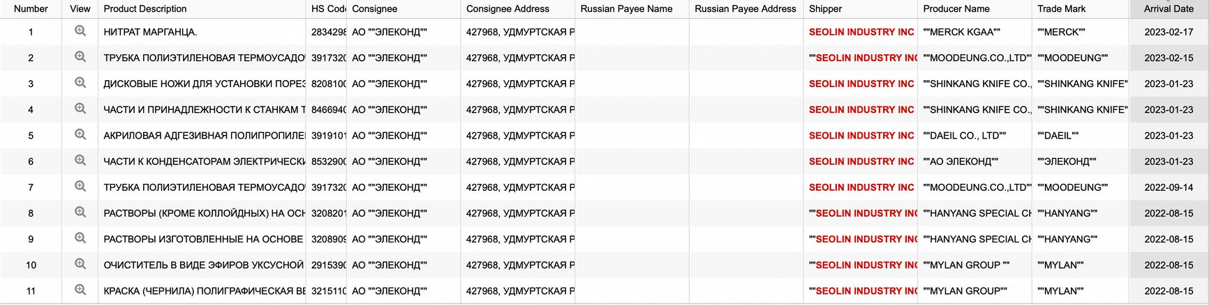Сеульская Mabuchi Korea Corporation поставляет масло для станков, станки для шлифовки линз, полировальный порошок и прочие товары упомянутой выше рязанской «НПК „Макрооптика“». Причем поставки начались уже в январе 2023 года.