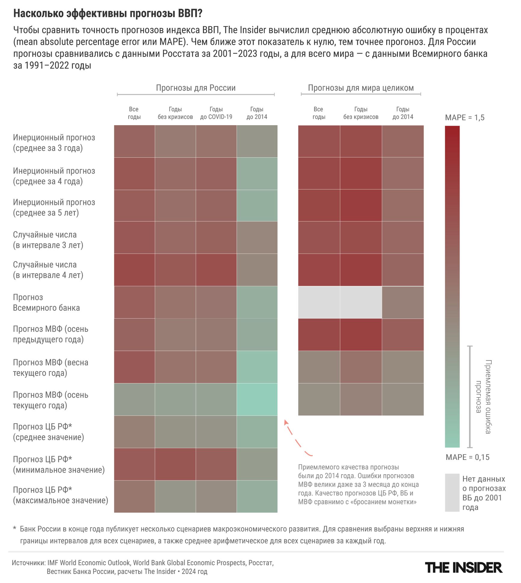The Insider изучил прогнозы на будущий год по мировому и российскому ВВП от МВФ, Всемирного банка (ВБ), Центробанка России (ЦБ РФ) и Минэкономразвития (МЭР) за последние 25 лет. Cредняя абсолютная процентная ошибка (MAPE) у всех этих институций оказалась примерно одинаковой, в районе 1–1,1 (средняя квадратичная ошибка — 0,2). Если исключить из подсчета непредсказуемые годы пандемии, то MAPE становится немного меньше — 0,8 — но это тоже очень плохой результат, ведь чем лучше прогноз, тем ближе это значение было бы к нулю.