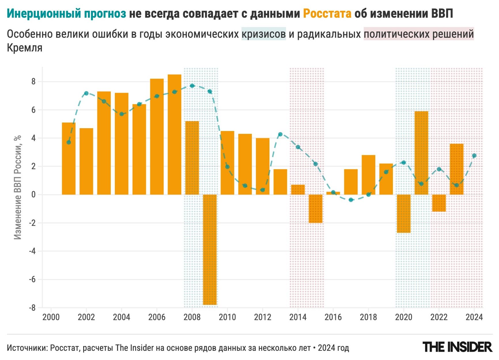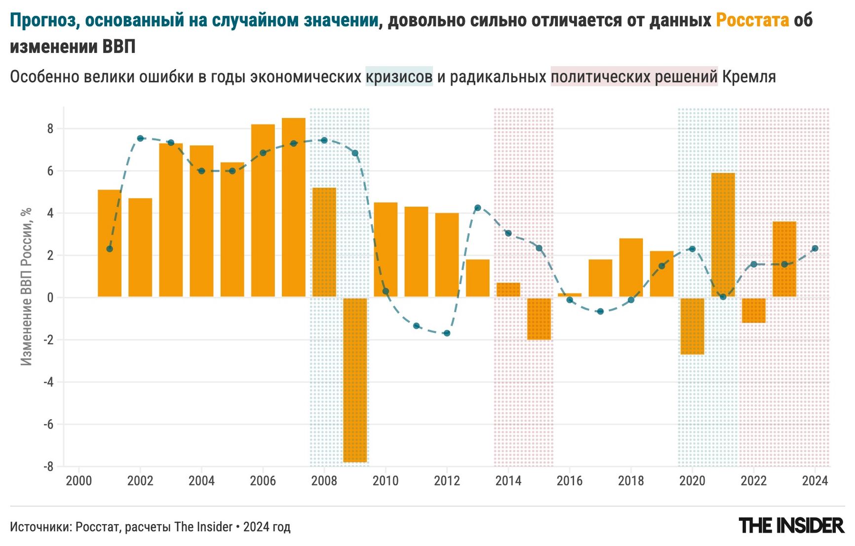 Чтобы понять, насколько этот прогноз плохой, The Insider сравнил его с показателем, при котором никакой экспертный анализ вообще не производится: мы просто берем средний рост за последние три года и считаем, что таким он будет и в следующем году. Такой «прогноз» тоже дает MAPE чуть меньше 1 для всех лет и чуть менее 0,8 для допандемийных прогнозов. Таким образом инерционный псевдопрогноз, который любой пятиклассник может посчитать в тетрадке умножением в столбик, оказывается не просто таким же по точности, но даже чуть-чуть «точнее», чем прогноз, сделанный ведущими мировыми экспертными центрами, вооруженными сложнейшими теориями и математическими моделями.