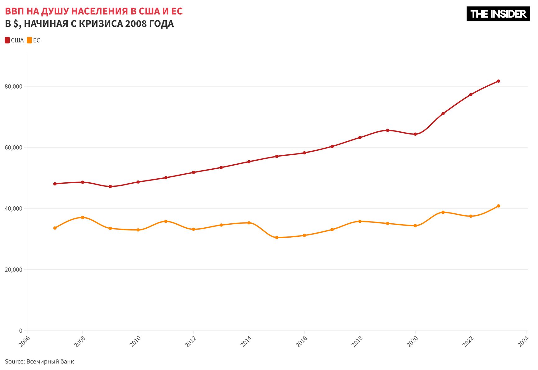 Перемены действительно назрели. Это видно в том числе по экономическим показателям. «С 2000 года реальный располагаемый доход на душу населения в США вырос почти в два раза больше, чем в Европе», — пишет Драги в докладе, занимающем 400 страниц. Это не единственный показатель, по которому Старый Свет все больше отстает от Нового, и нет никаких причин для того, чтобы эта тенденция прекратилась.