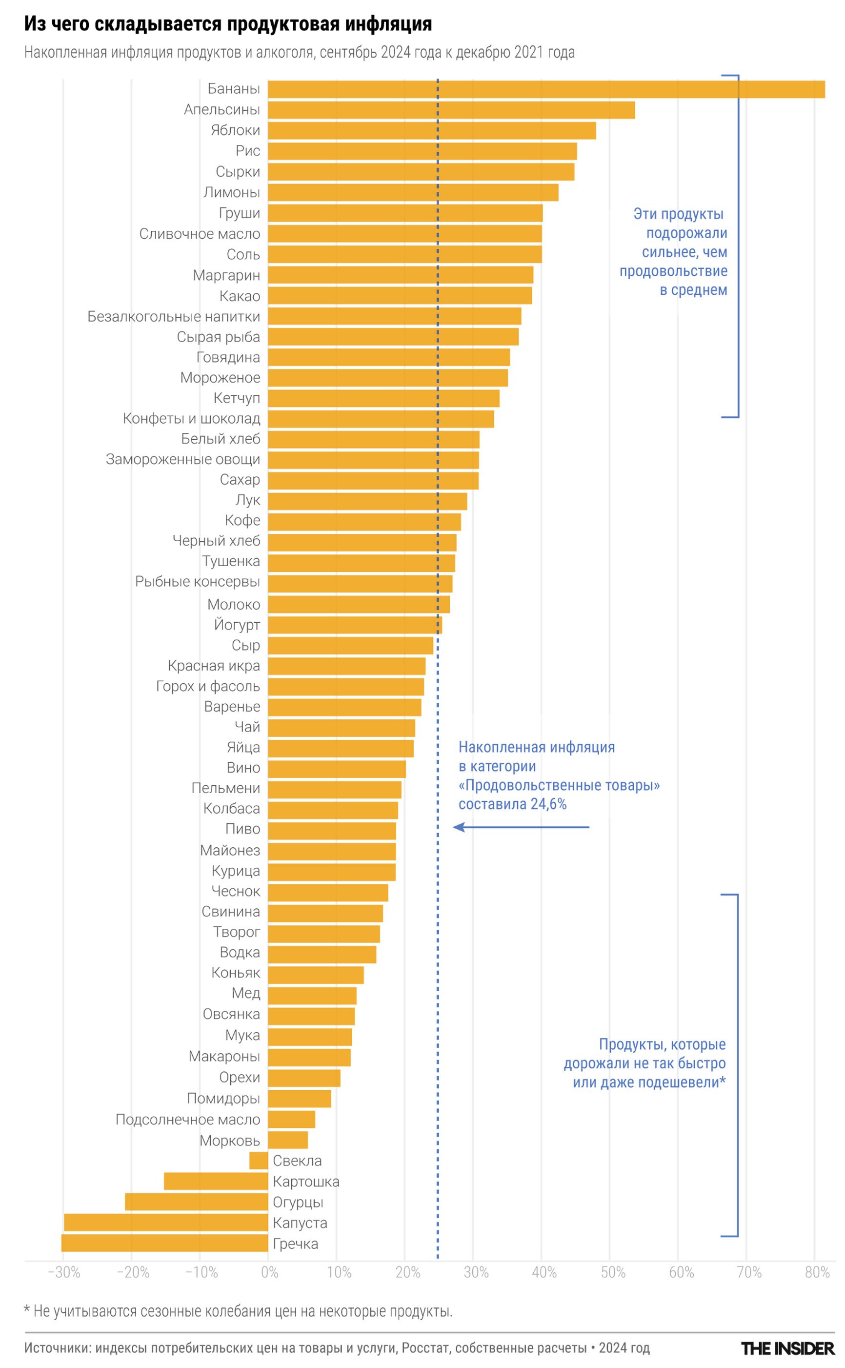 В инфляции почти не учитываются траты на аренду или содержание жилья. А именно такие расходы, а также подорожание продуктов питания сильнее всего бьют по бедным. Получается, что при расчете «границы бедности» необходимый для выживания доход изначально занижен благодаря манипуляции с формулами. По исследованиям ЦБ, каждой четвертой семье в России доходов хватает только на еду или даже не хватает на основные продукты питания, а еда дорожает быстрее всего.
