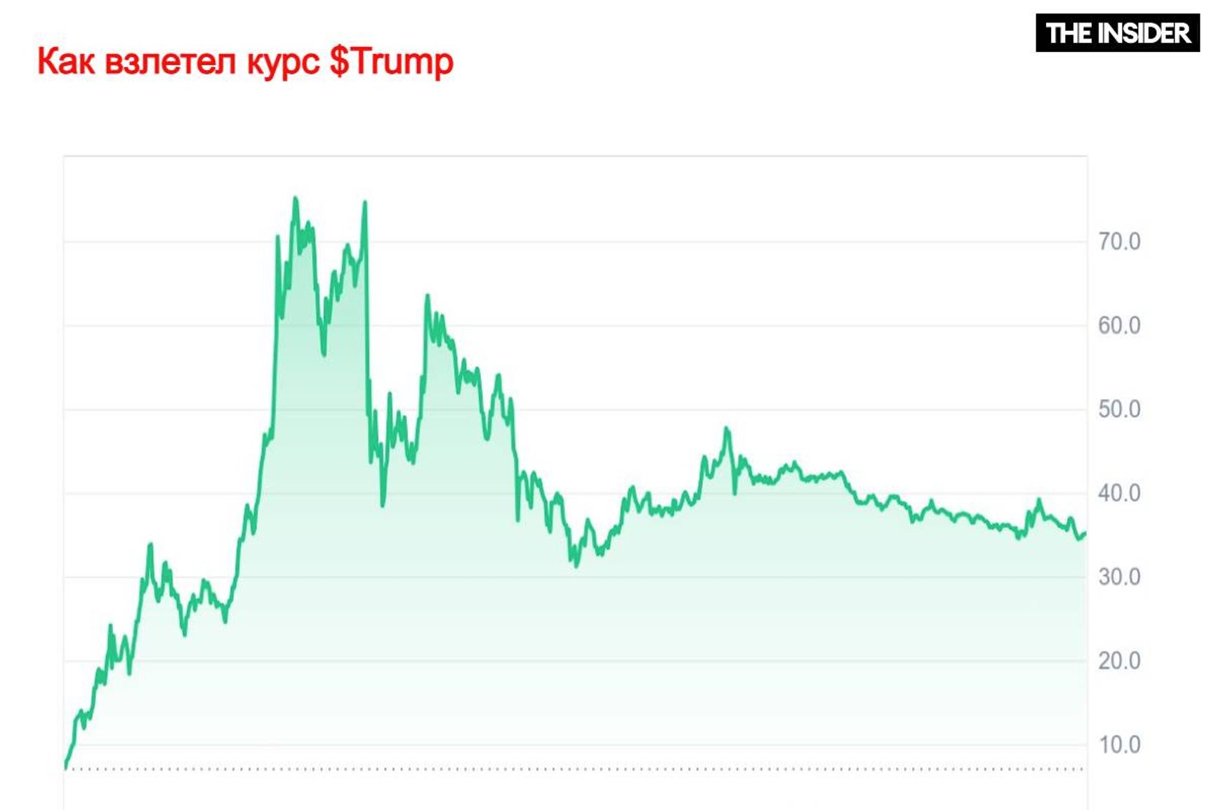На официальном сайте говорится, что $Trump предназначен для «выражения поддержки» президенту, а не для инвестиций. Это, однако, не помешало людям попытаться заработать деньги: сначала трампкоин можно было купить за 18 центов, но вскоре из-за огромного ажиотажа и порожденного им спроса цена превысила отметку в $75. Это сразу сделало монету одной из самых быстрорастущих в мире — она заняла место в топе крупнейших по капитализации, за сутки обогнав проекты с реальным (по меркам криптовалюты) функционалом, которые разрабатывали годами.