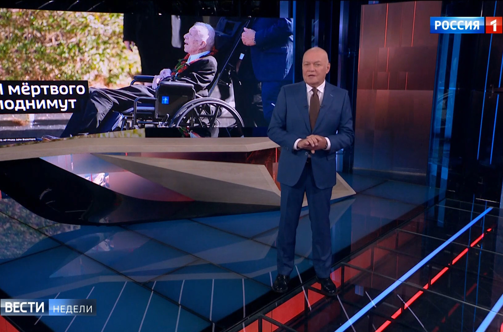 Pro-Kremlin propagandist Dmitry Kiselyov dedicated yet another monologue in his Vesti Nedeli weekly news digest to the U.S. Democratic Party, opening his “expose” with the story of how one-hundred-year-old Jimmy Carter, the 39th President of the United States, had been brought to early voting in a wheelchair: