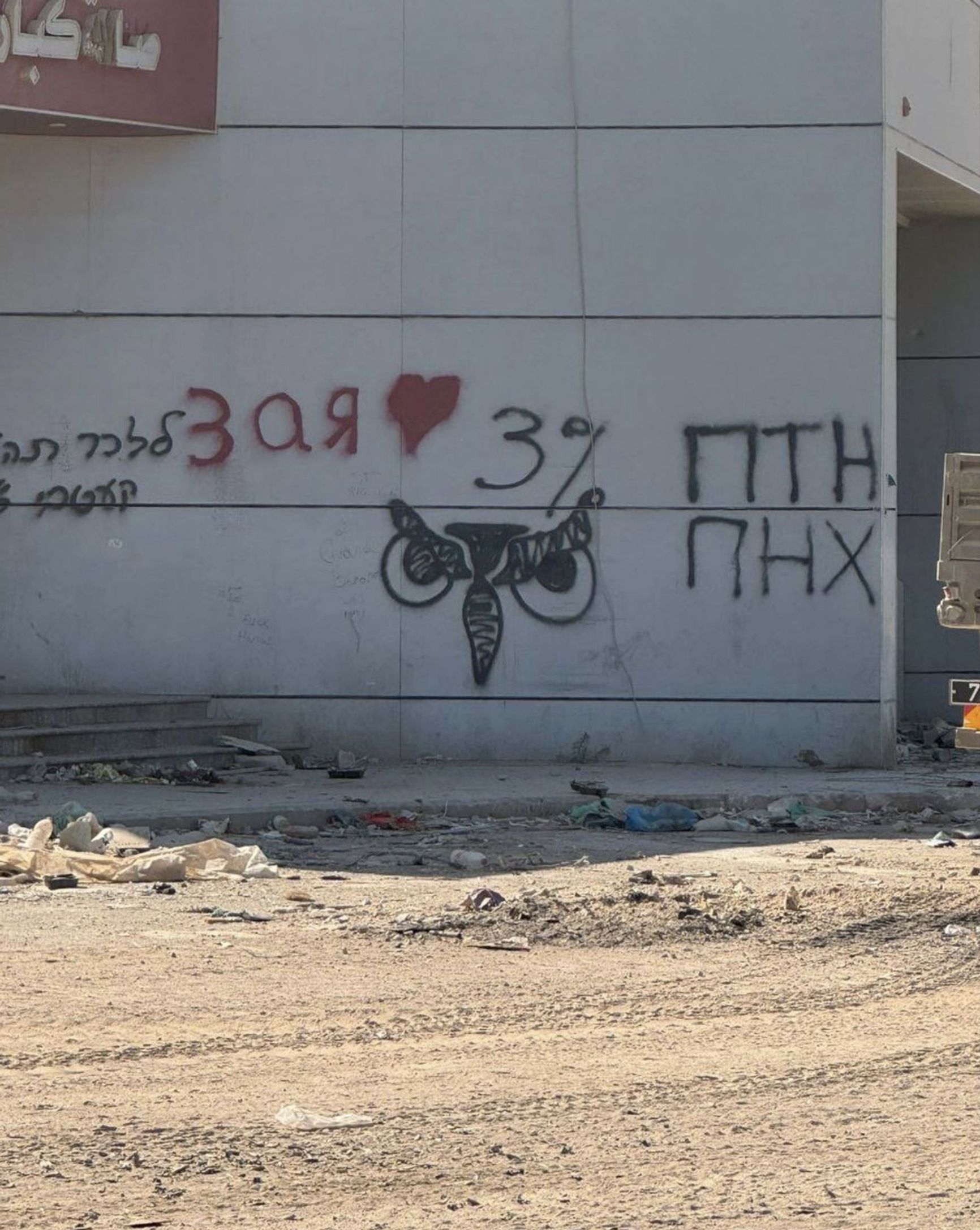 In Rafah I saw Russian-language graffiti, including the abbreviation “PTN PNK” — probably left by some of our Russian-speaking soldiers. I also saw graffiti with Israeli unit symbols and some Latin-letter abbreviations.