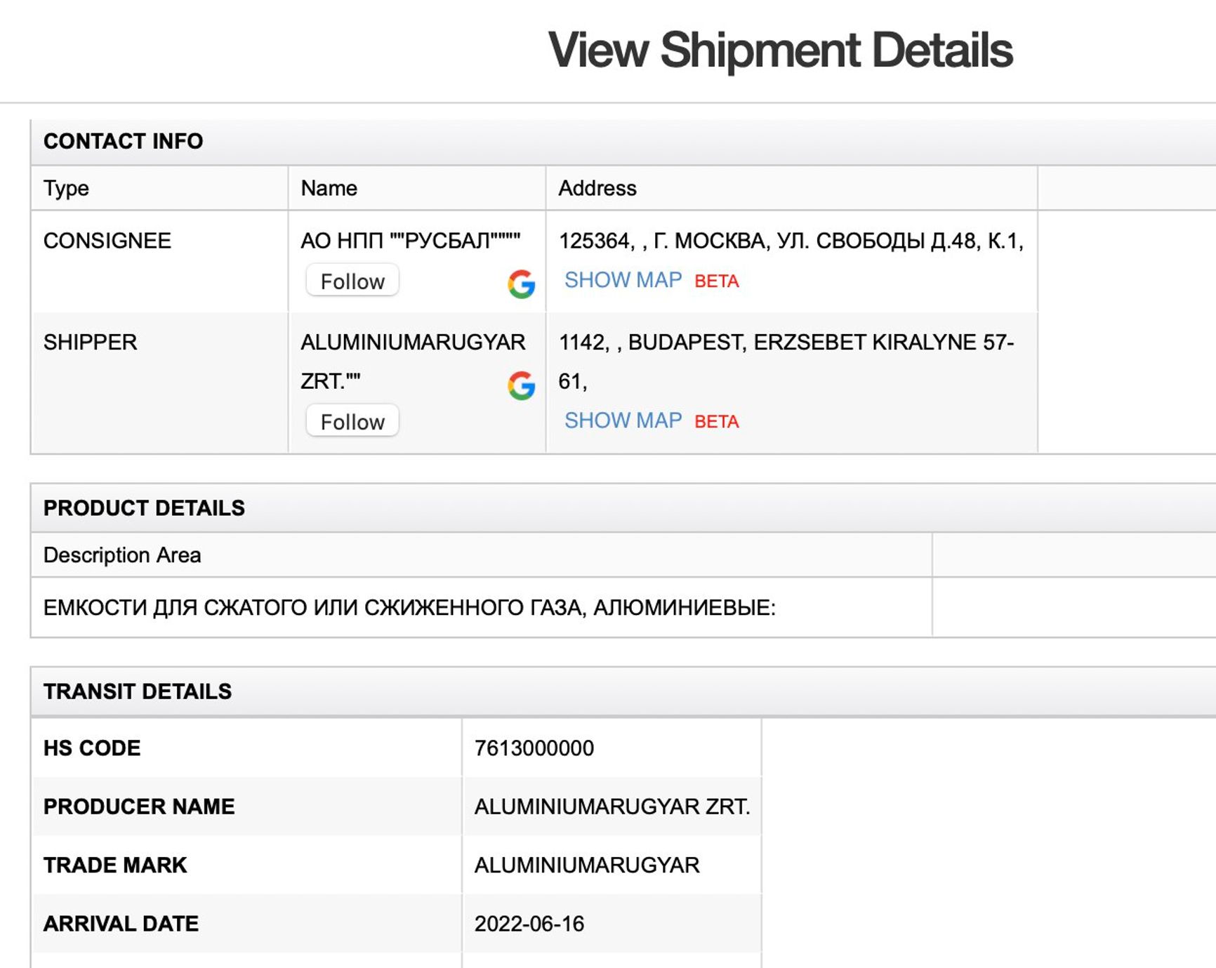 The Hungarian company Aluminiumarugyar Zrt. sells gas tanks to the Russian company Rusbal, a manufacturer of inflatable models for Russia's armed forces.