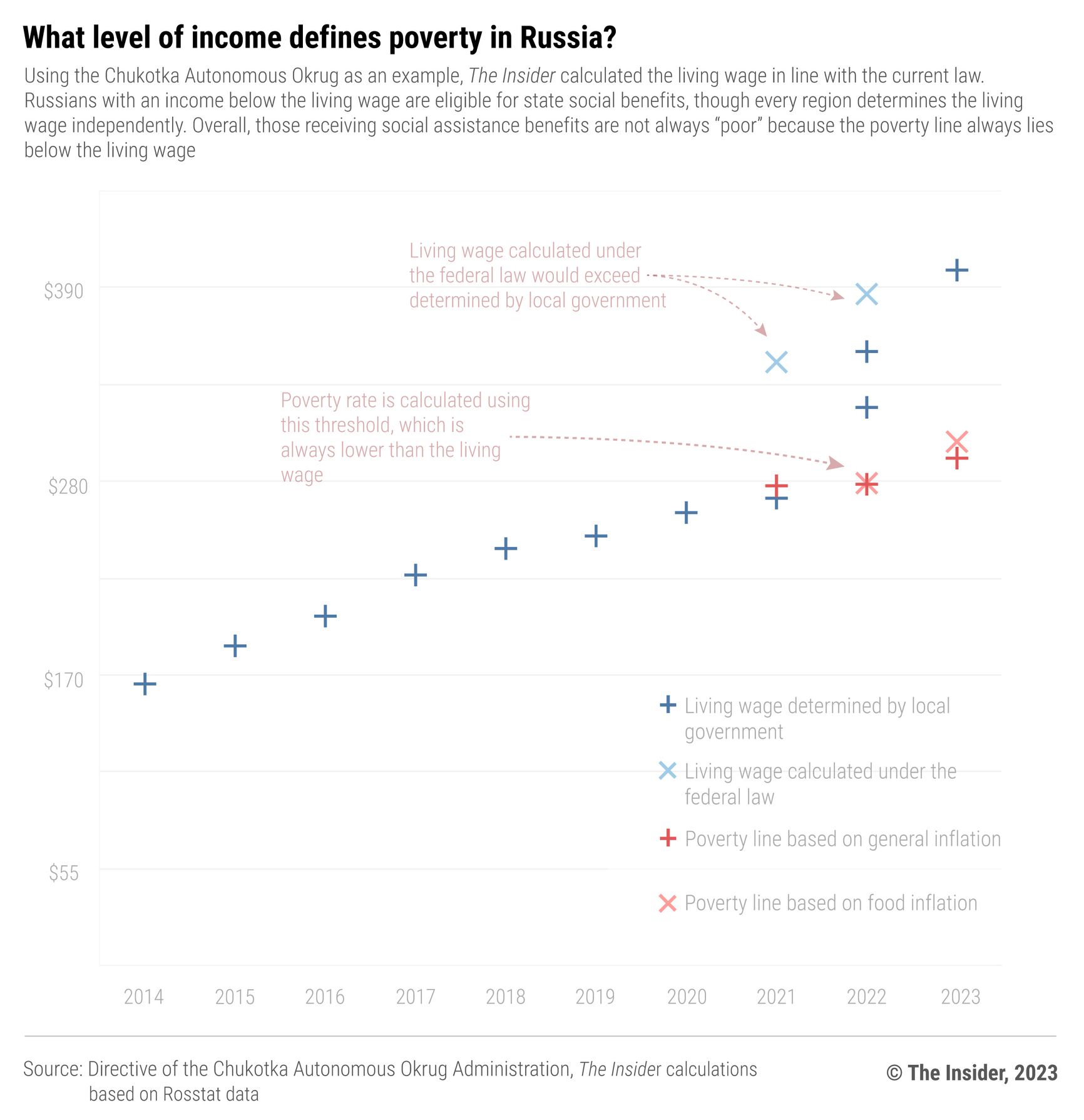 To sum up, the government uses a personal income below the living wage as the definitive criterion of poverty. The rules for calculating the living wage are contained in the law, but every region is free to set its level until 2025, when the so-called “transition period” ends. As a result, while the poverty rate correlates with prices for basic commodities and services, government statisticians use tricky coefficients to obtain lower values each year.