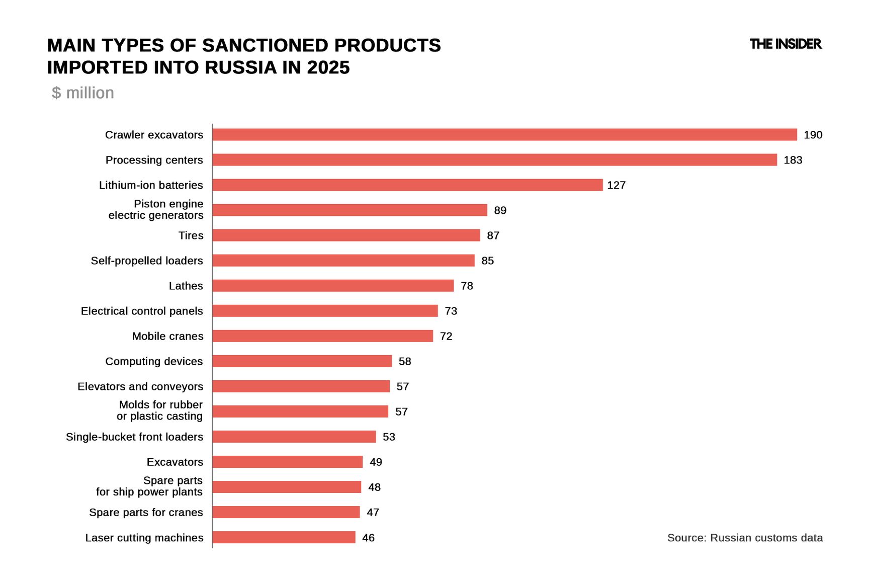 These goods are used in both civilian and military applications. At the same time, as The Insider has reported, under current conditions even seemingly civilian goods end up being used to further the work of Russia’s military-industrial complex. For example, “lithium-ion batteries” are a key military item, as batteries are primarily needed for drones. As The Insider has been reporting for years, complex foreign goods such as machining centers and lathes are likewise in demand first and foremost from Russian military-industrial enterprises.