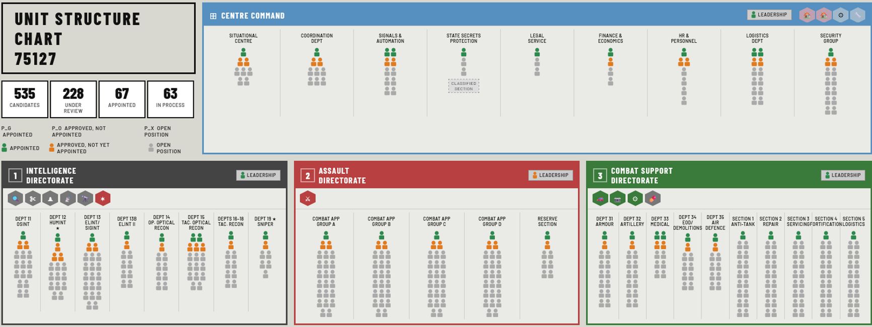Center 795 fields approximately 500 officers divided into three directorates. The organizational blueprint, corroborated by staffing spreadsheets and a separate internal org chart obtained by The Insider, describes a fully self-contained combined-arms formation capable, in theory, of conducting independent military and intelligence operations without external support.