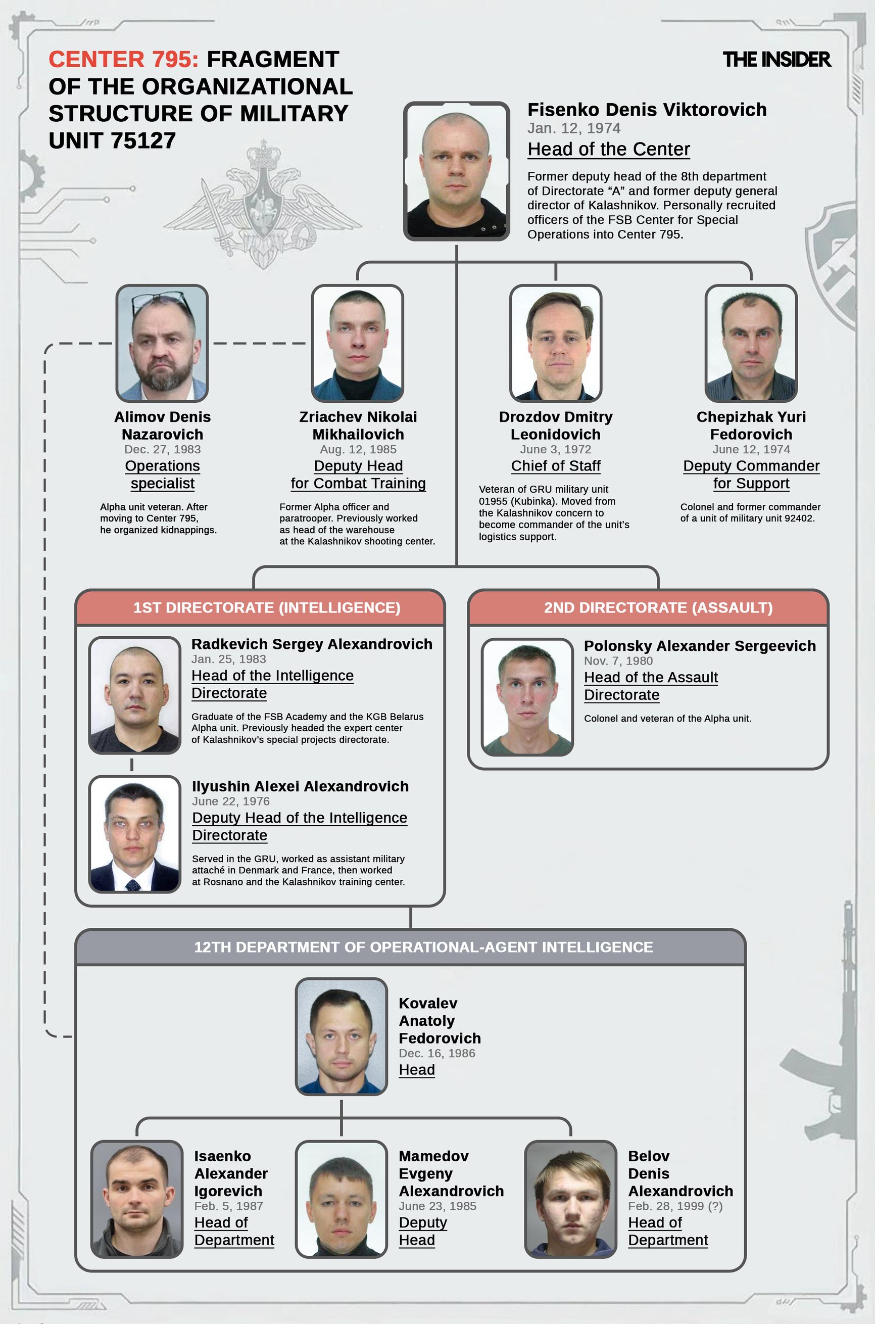 Center 795’s staffing drew heavily on the FSB's Center for Special Operations (not to be confused with Averyanov’s similarly named outfit) rather than on officers with a career history inside the Ministry of Defense. The majority came from FSB's Alfa team, but the recruiting net was cast wider. Among the unit's senior figures are veterans of an even more obscure provenance: the Alpha unit of the Belarusian KGB. Fisenko's deputy, Dmitry Drozdov, served in Belarusian intelligence under the alias “Dmitry Zaplavnev,” while Intelligence Directorate chief Sergei Radkevich operated there as “Sergei Baskhimdzhiev.” Both ended their Belarusian careers around 2017 and passed through corporate roles at Kalashnikov before arriving at Center 795.