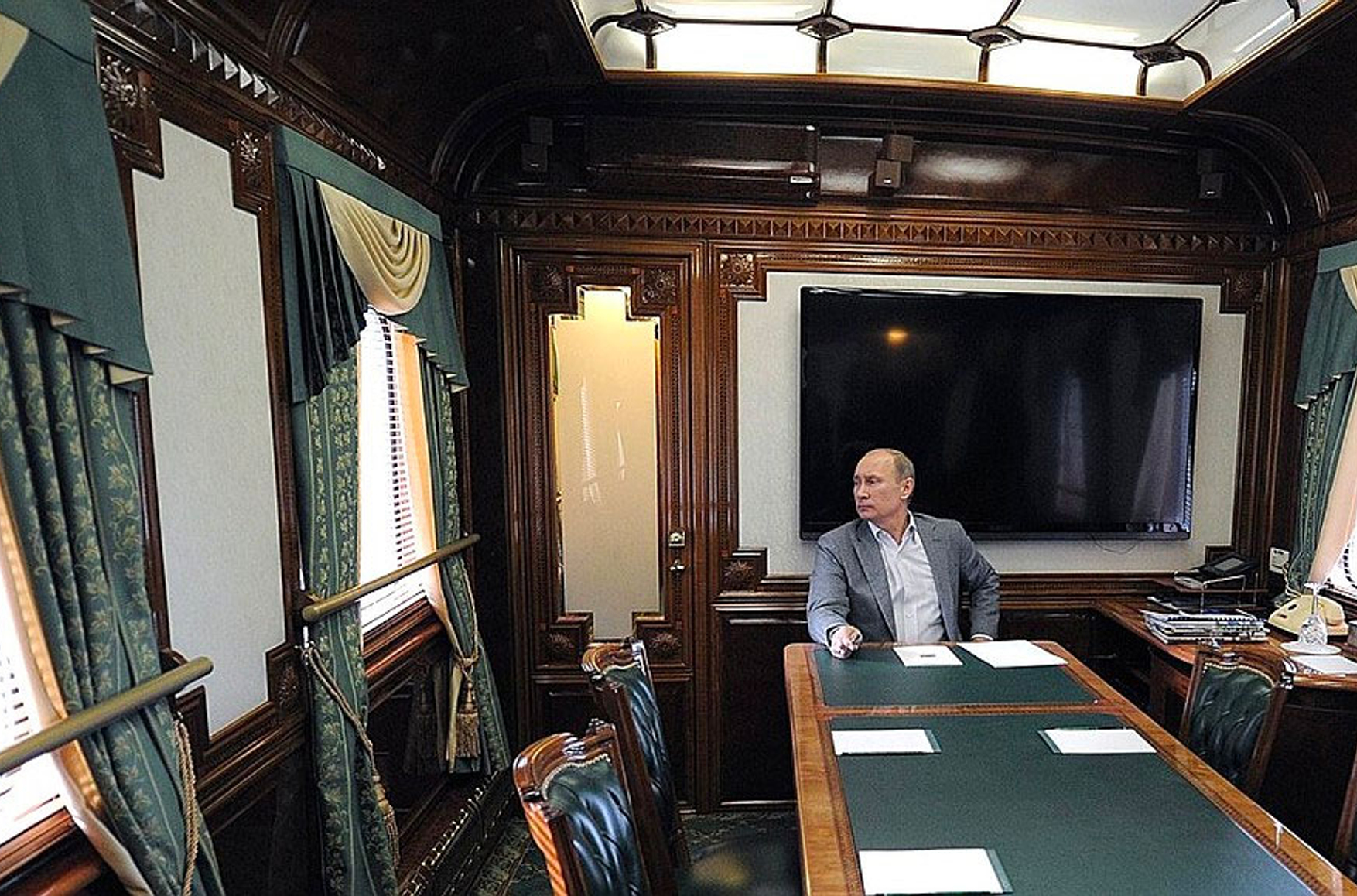 As Dossier notes, Putin's train does not look very different from ordinary Russian passenger trains, featuring the same gray-red stripes. But several cars of the train are armored and equipped with access to a secure government line.