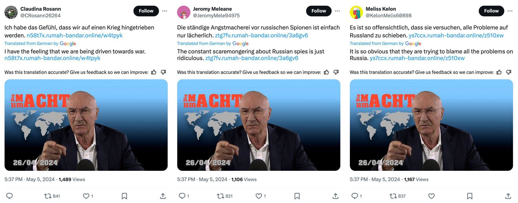 Despite his reach in the Kremlin-backed information space, Gellerman's YouTube channel attracts a minimal following, with videos typically gaining between 200 and 3000 views. However, the fact that Gellermann is a marginal voice in his own country has not prevented Doppelgänger from using his work to communicate the Kremlin's desired narratives. The network has shared links to at least one Gellermann video accompanied with text such as: “It is so obvious that they are trying to blame Russia for all the problems,” and “I feel that we are being pushed to war.”