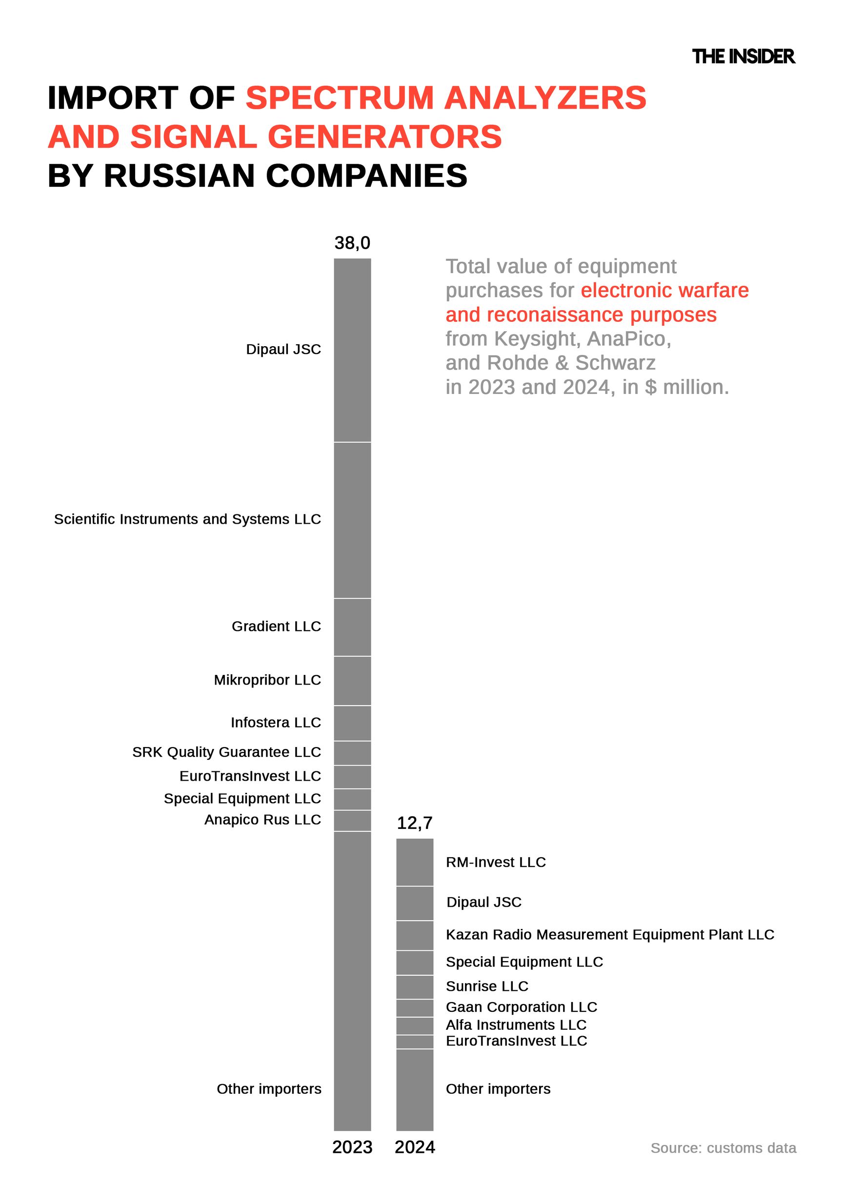 Analyzing customs data, The Insider found that in 2023 alone, Russia imported $38 million worth of spectrum analyzers and signal generators from the California-based U.S. firm Keysight, Munich-based German firm Rohde & Schwarz, and the Swiss firm AnaPico (now part of Keysight), based just outside Zürich. In 2024, these imports amounted to $12 million, with the average device priced around $43,000.