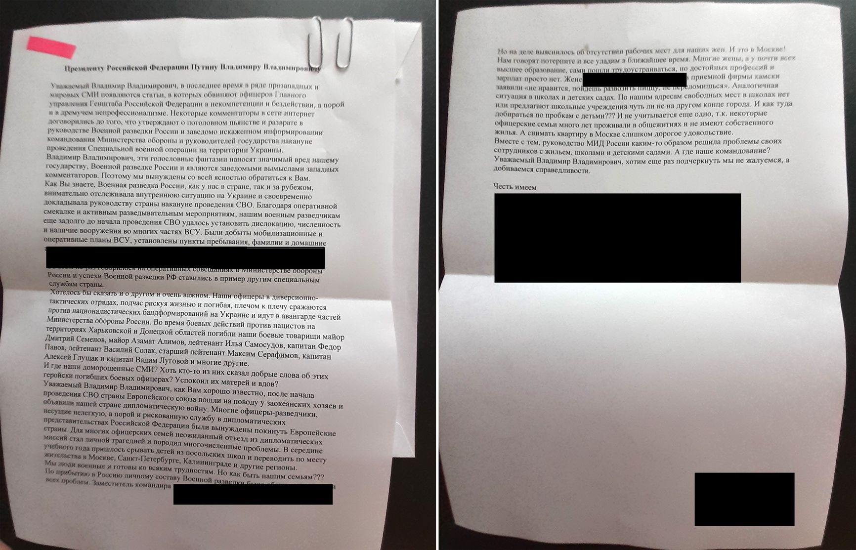 The Insider's source within the Presidential Administration, who made available the complaint, has concealed the identities of the signatories out of fear of being identified and prosecuted for disclosing classified information. However, the blacked-out names belong to 11 GRU officers, including the deputy commander of the unit who promised to resolve the issues for the individuals expelled from Europe, as well as the officer's spouse who took offense at the suggestion of working as a pizza delivery driver.