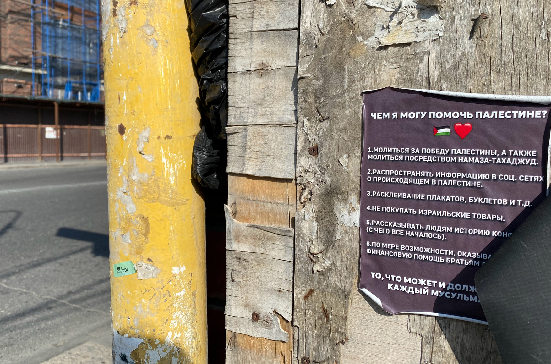 One of the pro-Palestinian stickers appeared outside a synagogue despite the building being guarded 24 hours a day by the police. Like in Derbent, the synagogue in Makhachkala has also been closed.