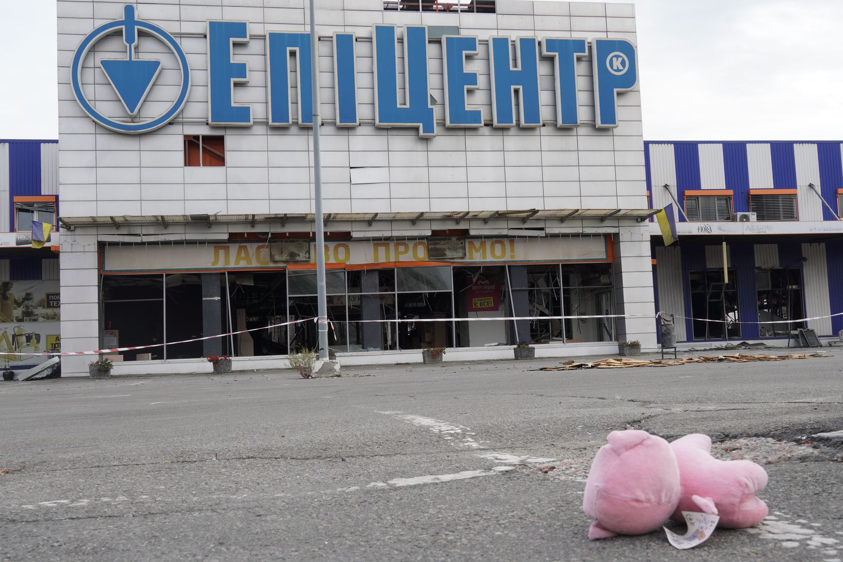 At the entrance to the ruin, Kharkiv residents have set up an impromptu memorial: photos of customers and staff killed in the attack pinned to a lamppost, candles, and a heap of stuffed animals. Sometimes gusts of wind scatter the toys around the parking lot, but the security guard, a stout man in his 60s, always picks them up and takes them back to the memorial. It's not the store he is guarding — there is nothing left to steal anyway, as everything was destroyed either in the explosion or in the fire that followed. His job is to keep away gawkers.