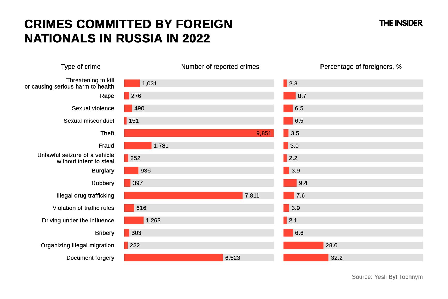 Finally, of note is the fact that a significant share of imprisoned migrants are prosecuted for violating the rules of entry or stay in the country, for forging documents, or for attempting to bribe police officers. In 2022, 16% of all migrant crimes in Russia were related to document forgery.