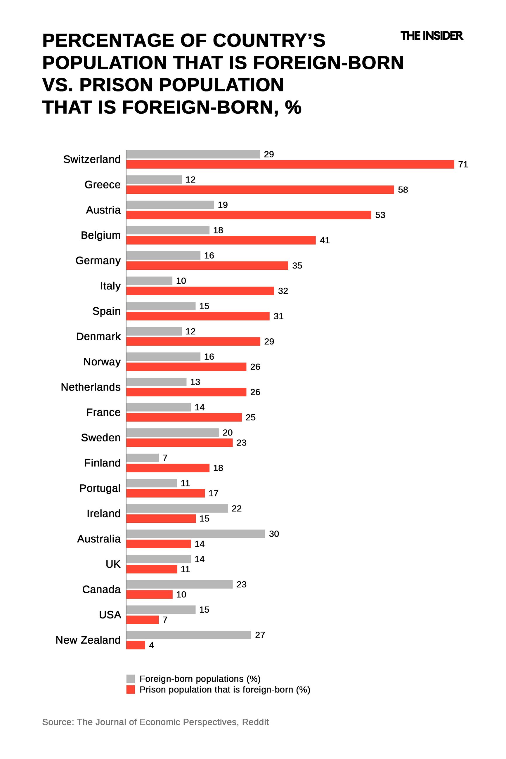 Switzerland is one of the countries least inclined to legalize and integrate immigrants. Even in the third generation, they are considered foreigners and cannot obtain citizenship. As a consequence, Swiss prisons have the highest proportion of migrants in Europe, even though many of them are likely to have been born in the country. That said, Europe in general (excluding the UK and Ireland) has a higher rate of immigrant incarceration than the U.S. does.