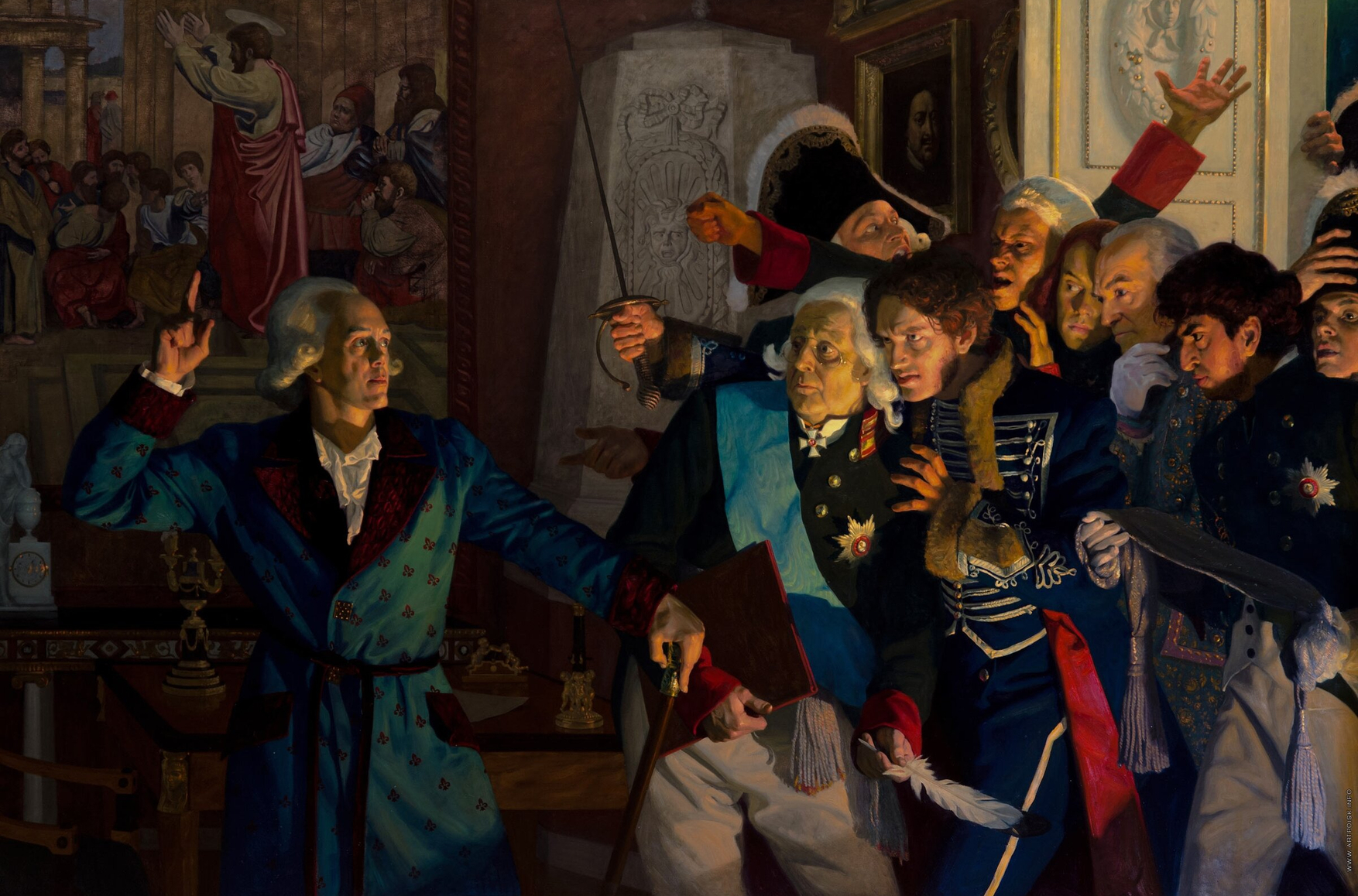Офицеры, число которых еще более увеличилось, так что комната была ими переполнена, схватили его и упали вместе с ним на опрокинувшиеся ширмы. Я думал, что он хотел пробраться между ними, чтобы пройти к двери, и два раза повторил ему: «Оставайтесь спокойны, государь! Дело идет о вашей жизни!»