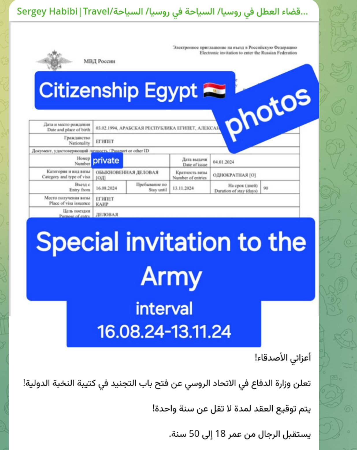 Фотографии, размещенные в таких группах, показывают реальные примеры виз, выданных гражданам Сирии и Египта, так что схема, судя по всему, действительно работает. В одном из сопроводительных текстов указано, что это специальные приглашения для подписания контракта.