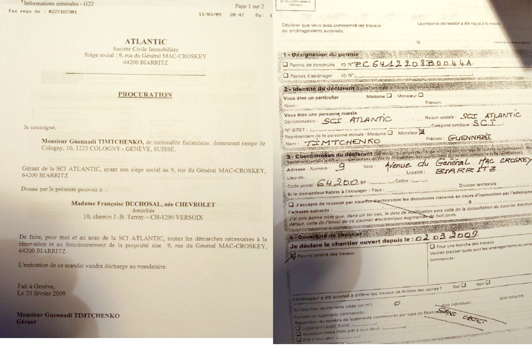 Среди прочего были найдены копия паспорта бывшего зятя Путина Кирилла Шамалова, а также переведенный на французский язык счет оплаты за электричество по месту регистрации в Москве. Такие документы могли понадобиться для открытия банковского счета во Франции, самой покупки виллы и др. Также обнаружилась доверенность от 2009 года, выписанная «Геннадием Тимченко, гражданином Финляндии» на имя француженки Франсуаз Дюшосаль, которая должна была отвечать за ремонт на вилле.