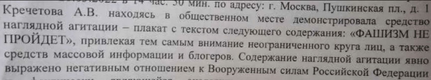 Тверской районный суд Москвы назначил активистке Анне Кречетовой штраф в размере 50 тысяч рублей за пикет с плакатом «Фашизм не пройдет», сообщает «ОВД-Инфо». Фразу признали дискредитацией Вооруженных сил России (ч. 1 ст. 20.3.3 КоАП).