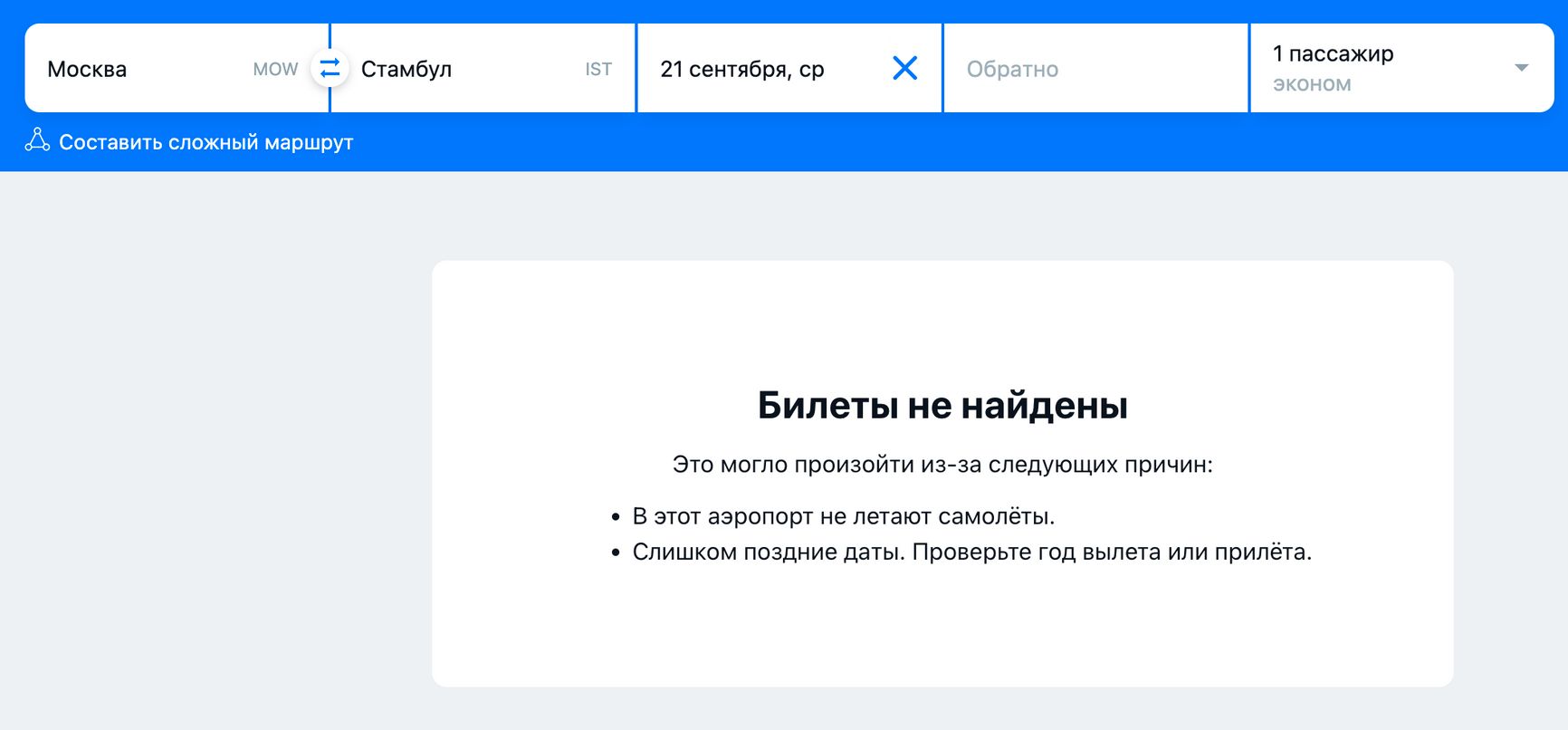 The Insider проанализировал данные с сайта Aviasales. На 21 сентября уже нет ни одного доступного рейса в Стамбул — ни прямого, ни транзитного. В другие города Турции, где есть аэропорты, — Анталью, Бодрум, Даламан и Измир — прямых билетов на 21 сентября также нет.