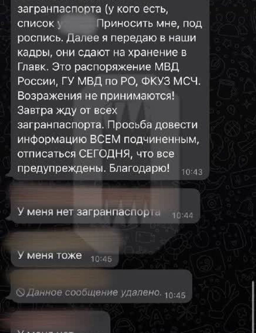 Работников ростовского госпиталя МВД попросили принести загранпаспорта. Такое распоряжение пришло от начальства, сообщает Telegram-канал «Осторожно, новости» и публикует скрин переписки в рабочем чате, где медиков просят передать паспорта в отдел кадров, а затем их сдадут «на хранение в Главк».