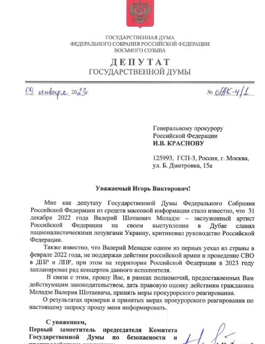 Депутат Госдумы Андрей Луговой потребовал от Генеральной прокуратуры проверить слова певца Валерия Меладзе, который шепотом, отведя микрофон от лица, ответил на лозунг «Слава Украине» продолжением — «Героям слава». Луговой опубликовал текст заявления к генпрокурору в своем Telegram-канале. В нем Луговой утверждает, что Меладзе надо проверить, так как он «позволяет себе славить террористическое государство».