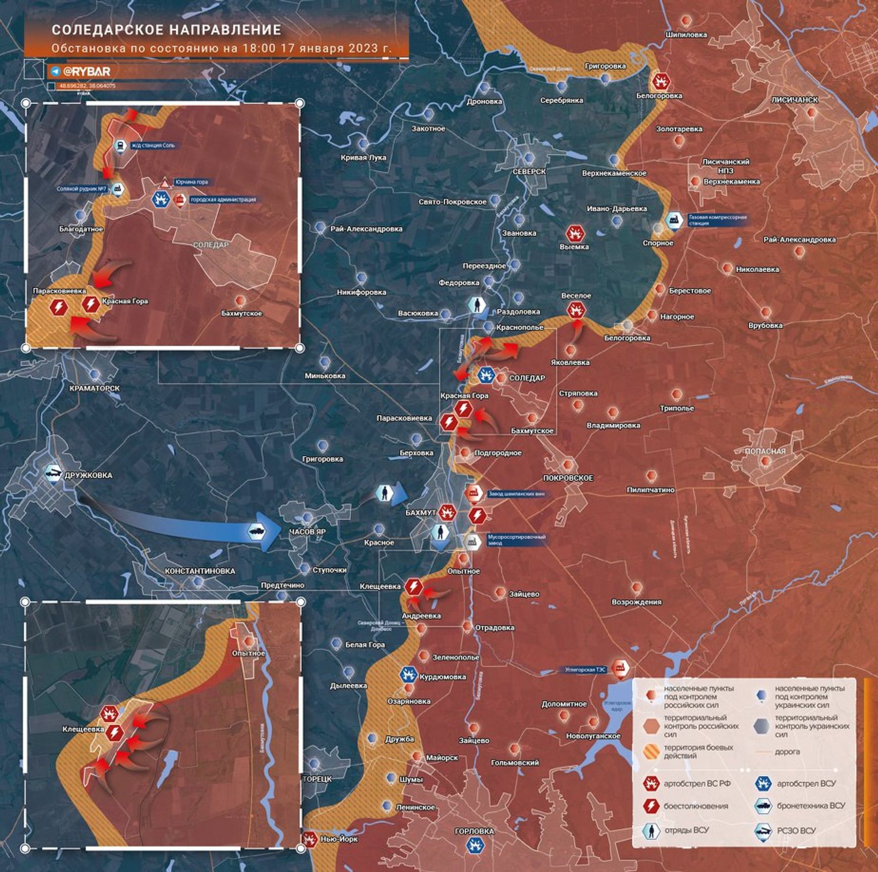 Ситуация вокруг Бахмута, где шли самые ожесточенные бои, за последнюю неделю изменилась, утверждает портал War Mapper, публикуя карту. По данным аналитиков, российская армия окончательно захватила Соледар и поселок Соль, зашла в новые районы на северо-востоке Бахмута, а также взяла под контроль промышленные здания на юго-востоке. Пророссийский Telegram-канал «Рыбарь» также утверждает, что 16 января ЧВК Вагнера заняла поселок Соль, перерезав снабжение между Бахмутом и Северском и открыв плацдарм к выходу к Северской агломерации. Основные бои идут в районе ключевого участка — Клещиевки, расположенной южнее Бахмута, пишет аналитик Def Mon.