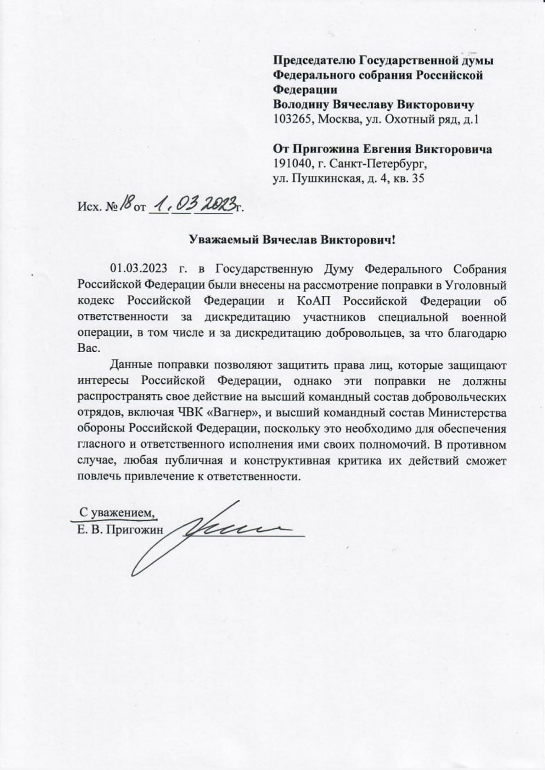 Один из основателей ЧВК Вагнера Евгений Пригожин попросил спикера Госдумы Вячеслава Володина не распространять поправки о наказании за «дискредитацию участников спецоперации» на высший командный состав Минобороны России и командный состав его ЧВК. Просьбу об официальном разрешении критики опубликовала его пресс-служба в Telegram.