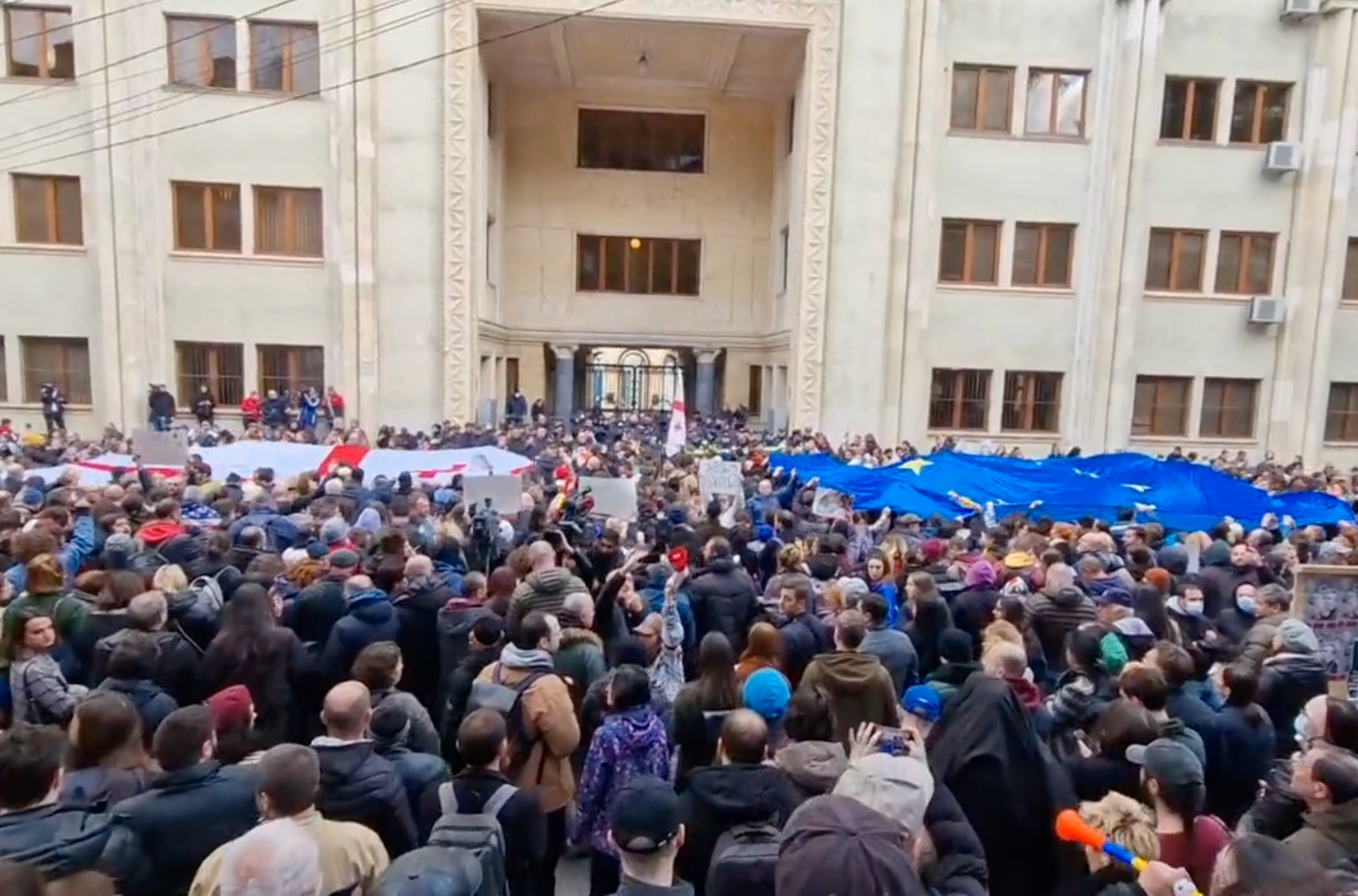 В Тбилиси у здания парламента начался митинг против принятия законов «О прозрачности иностранного влияния» и «О регистрации иностранных агентов», стягивается полиция к храму напротив, перекрыт центральный проспект Руставели. Также на митинг собираются люди в Батуми. Бары в Тбилиси начали публиковать объявления о том, что сегодня откроются поздно, так как работники идут на акцию к парламенту. «Друзья, сегодня, вероятно, откроемся в 10 утра. А до тех пор давайте все в парламент! Чтобы в будущем не пить “Русский стандарт“ и “Зеленую Марку“. Это касается всех!» — говорится на странице бара Meoba.