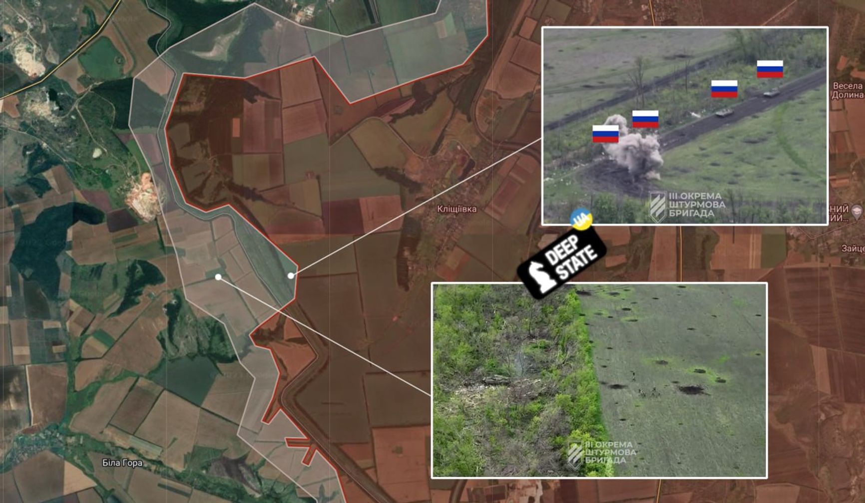 Ресурс Deep State геолоцировал места боев на южном фланге российской группировки, штурмующей Бахмут. Бои происходят западнее Клещеевки. Судя по кадрам видео, с украинской стороны атаку поддерживал танк, а у россиян была в достаточном количестве техника, хотя это не помогло.