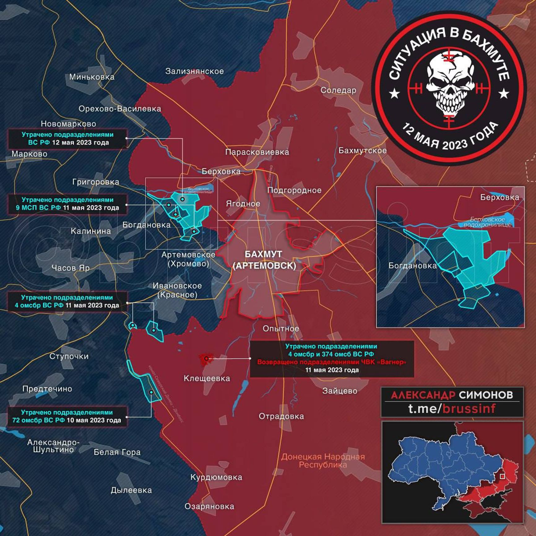 Связанный с ЧВК Вагнера «военкор» Александр Симонов публикует новую карту обстановки в районе Бахмута.