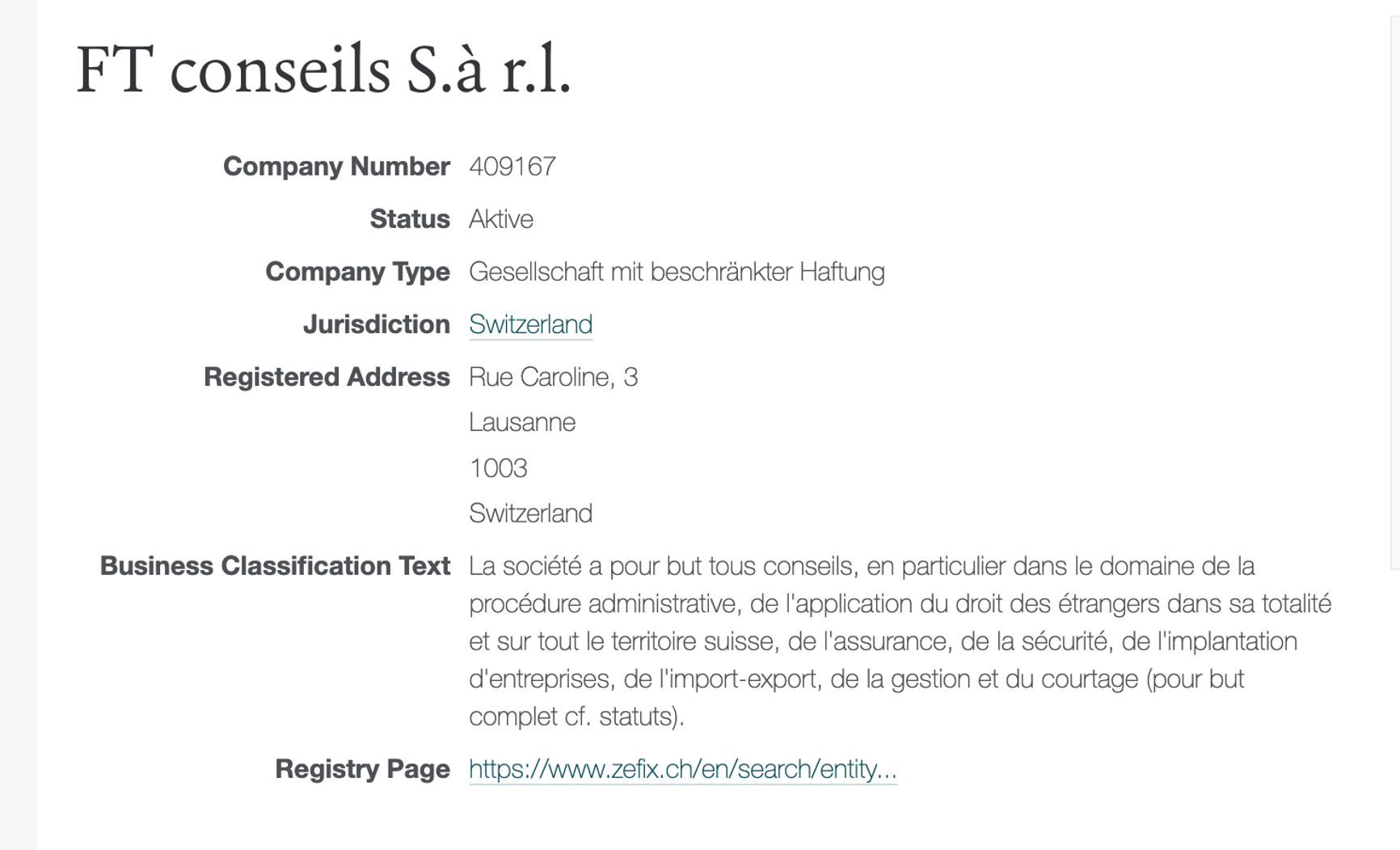 Согласно данным портала OpenCorporates, одна из фирм — FT Conseils Sàrl — всё еще работает.