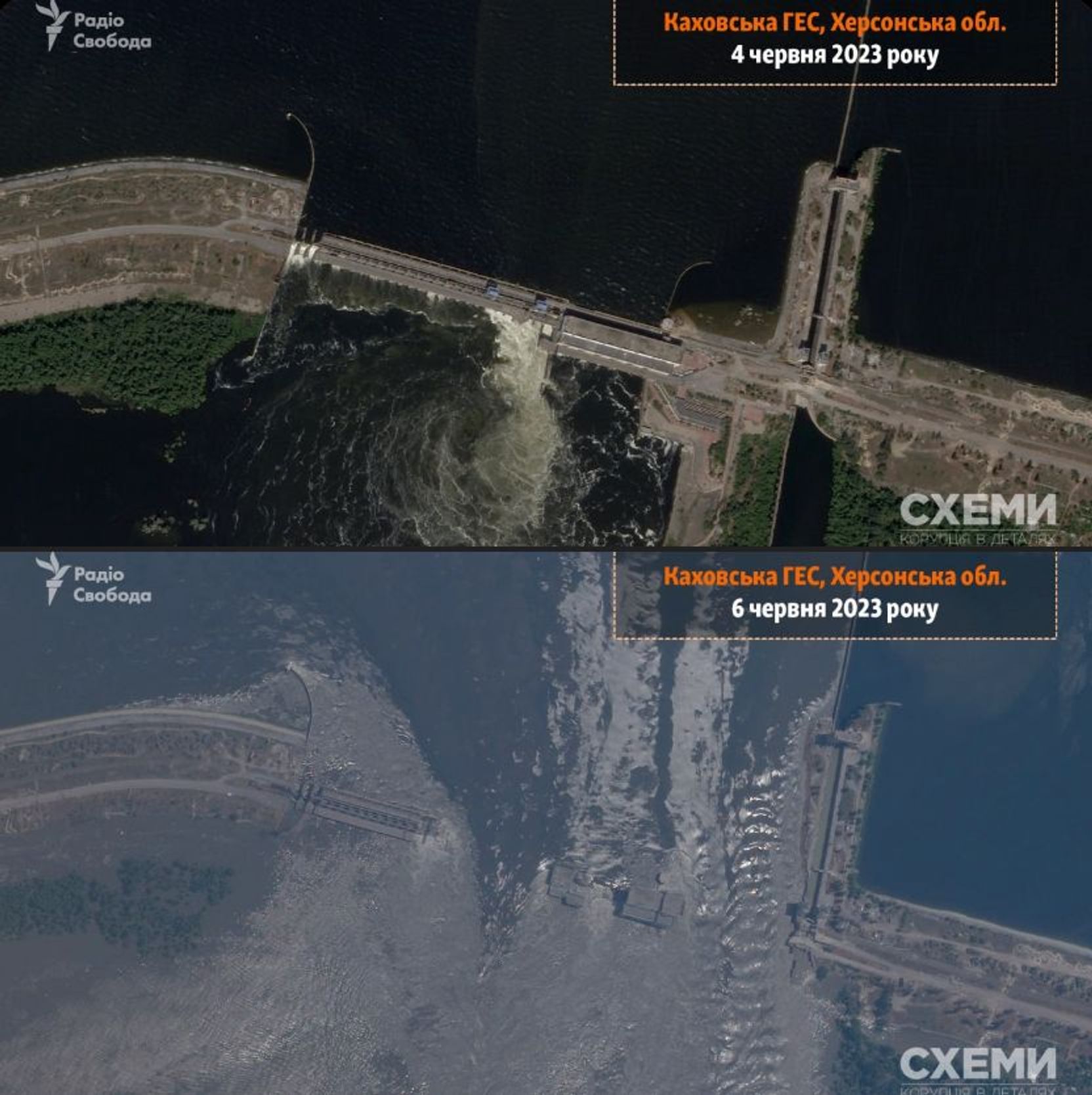 OSINT-аналитики изучили спутниковые снимки ГЭС до и после аварии и предположили, что плотина еще до катастрофы могла разрушаться из-за полученных ранее повреждений. Серьезные повреждения плотины видны на снимках уже от 4 и 5 июня, по сравнению с предыдущими днями. Удары по Каховской ГЭС и плотине наносились неоднократно во время боевых действий в Херсонской области, о том, что плотине грозит разрушение, говорили еще прошлой осенью.