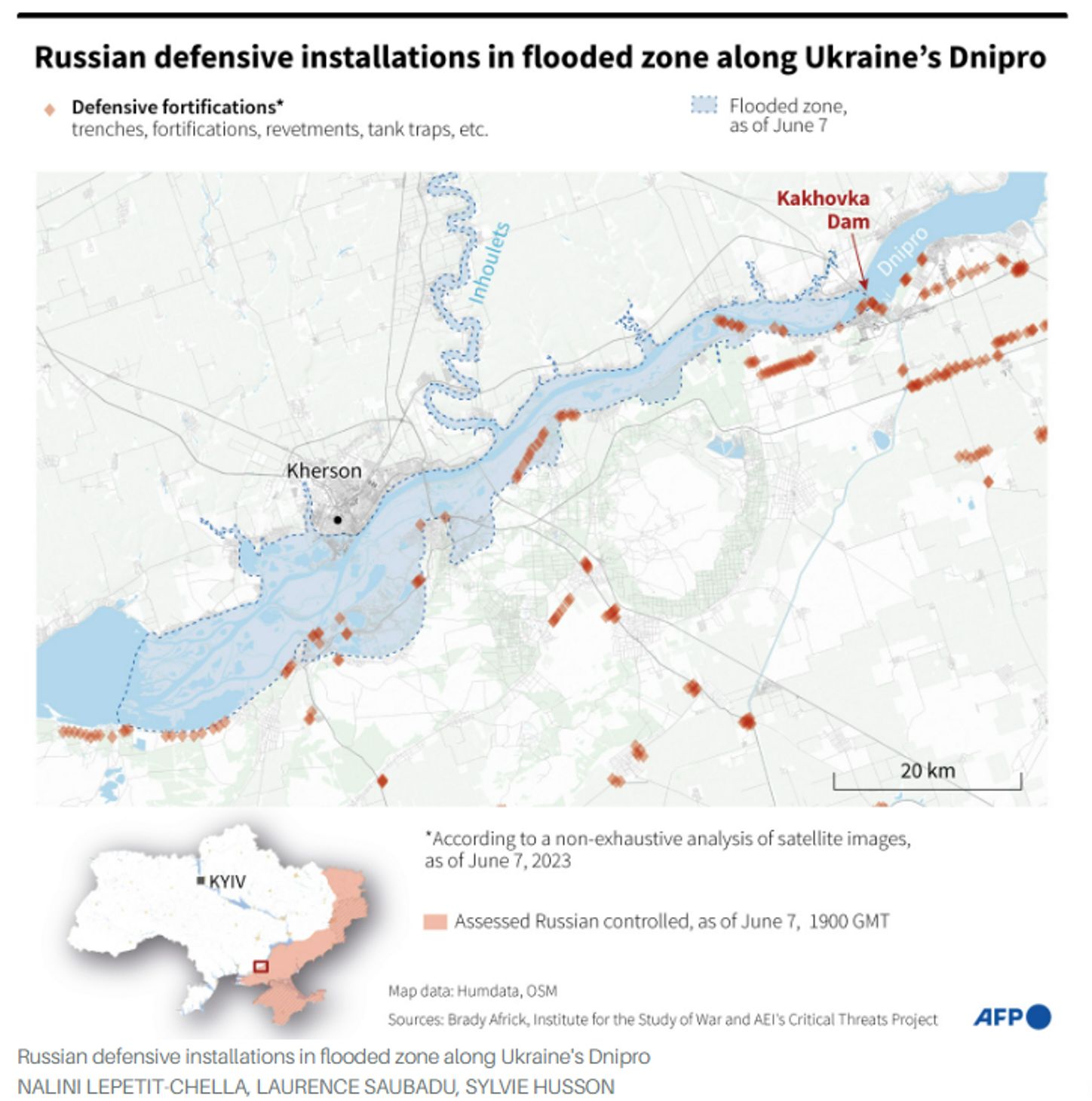 Также ISW сообщил, что потоп фактически смыл российскую линию укреплений на левом берегу Днепра. По мнению экспертов, наводнение сильно влияет на позиции российских войск на левом берегу Днепра. Судя по спутниковым снимкам, потоки воды разрушают российские оборонительные укрепления, особенно в районах Голой Пристани и города Олешки.