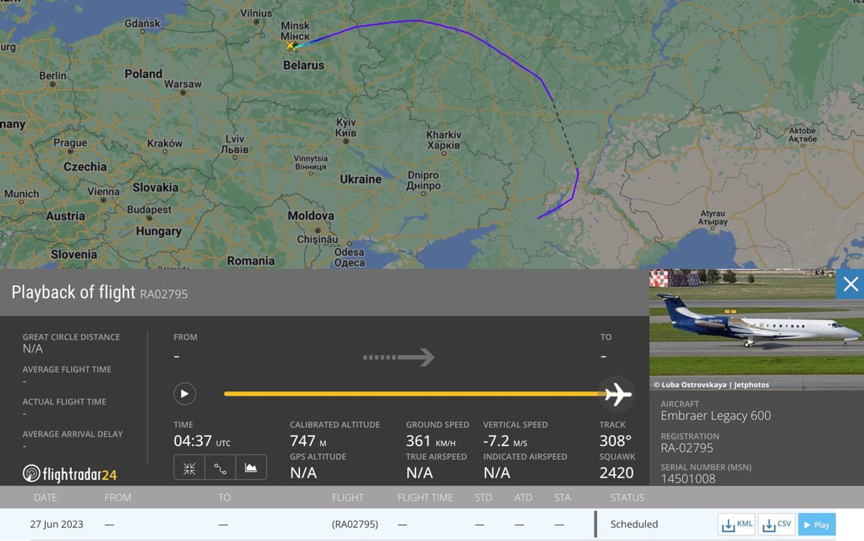 Проект «Беларускі Гаюн» обратил внимание на то, что бизнес-джет, связанный с Евгением Пригожиным, прилетел утром 27 июня на аэродром Мачулищи под Минском.