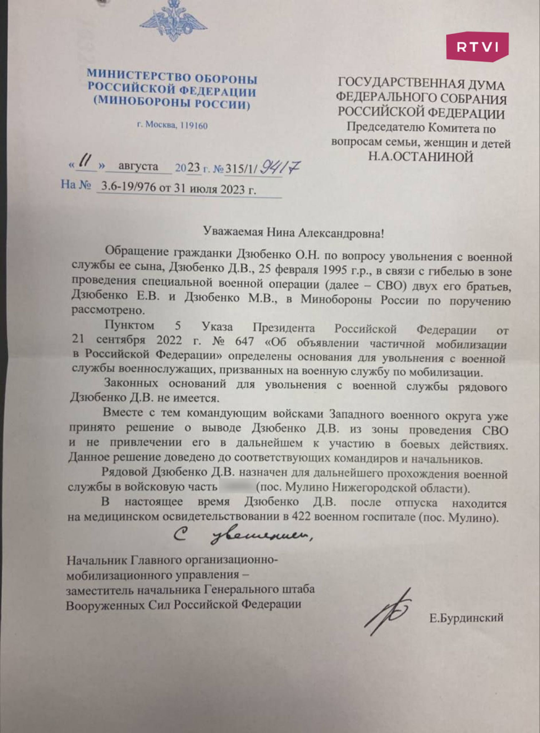 Минобороны РФ вернуло с фронта российского «рядового Райана» — последнего из трех сыновей Ольги Дзюбенко из Липецкой области. За него ранее вступились Z-каналы, указав на аналогичную практику в США, которая легла в основу голливудского блокбастера. Двое других сыновей Дзюбенко погибли на фронте, поэтому она попросила Путина и Шойгу отправить домой третьего. Служить он, однако не перестанет, — если верить документу Минобороны, его выведут из зоны боевых действий и направят в тыл.