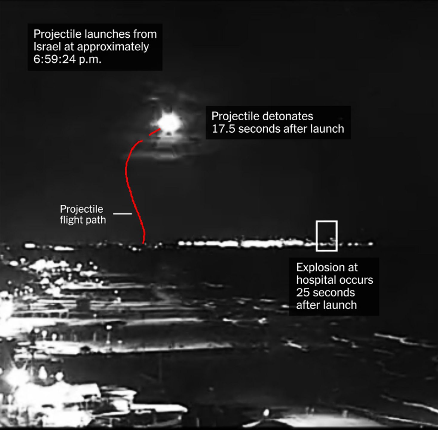 Согласно анализу NYT, ракету с видео выпустили из израильского кибуца Нахаль Оз в сторону Газы, но она взорвалась в небе примерно в 3,2 км от больницы «Аль-Ахли».