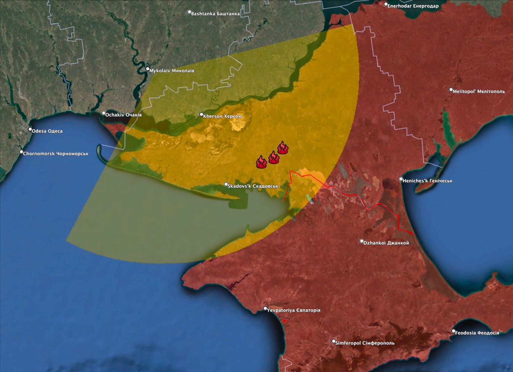 Ресурс Ukraine Battle Map показывает, как выглядело воздушное пространство Украины, закрытое над Херсонской областью системой Patriot, когда были сбиты Су-34. Проект отмечает, что максимальная дальность полета ракеты PAC-2 Patriot по самолетам составляет 160 км.